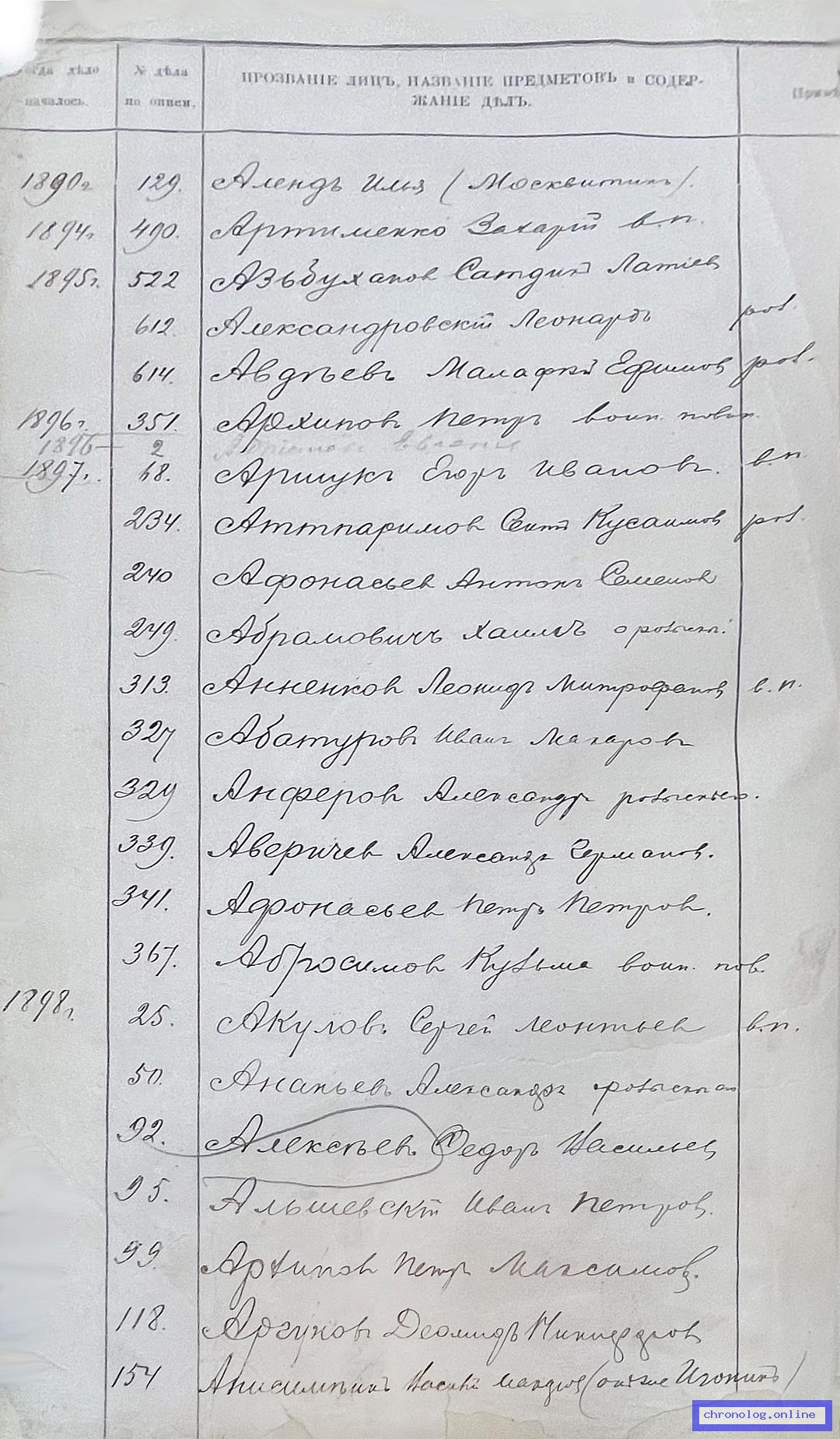 РГИАДВ 704-4-727, Л.1об (Алфавитный список ревизских дел 4-го стола за 1898 год ): Аргуков Деомид Никифорович показан со ссылкой на дело №118 (старая опись, нумерация не действительная) за 1898 год. Время и место исхода не показано. Снимки: 1об. | ||||