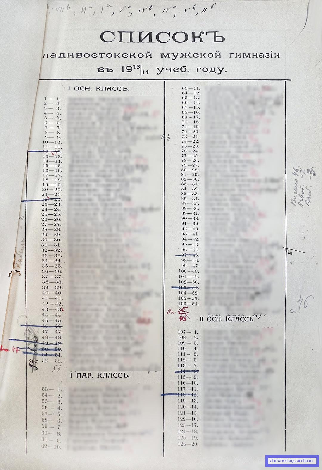 РГИАДВ 138-1-158, Л.2 (Список учащихся Владивостокской мужской гимназии в 1913 году): Учащийся четвёртого параллельного класса Николаев Михаил. Время и место исхода не показано. Снимки: 1, 2. | ||||