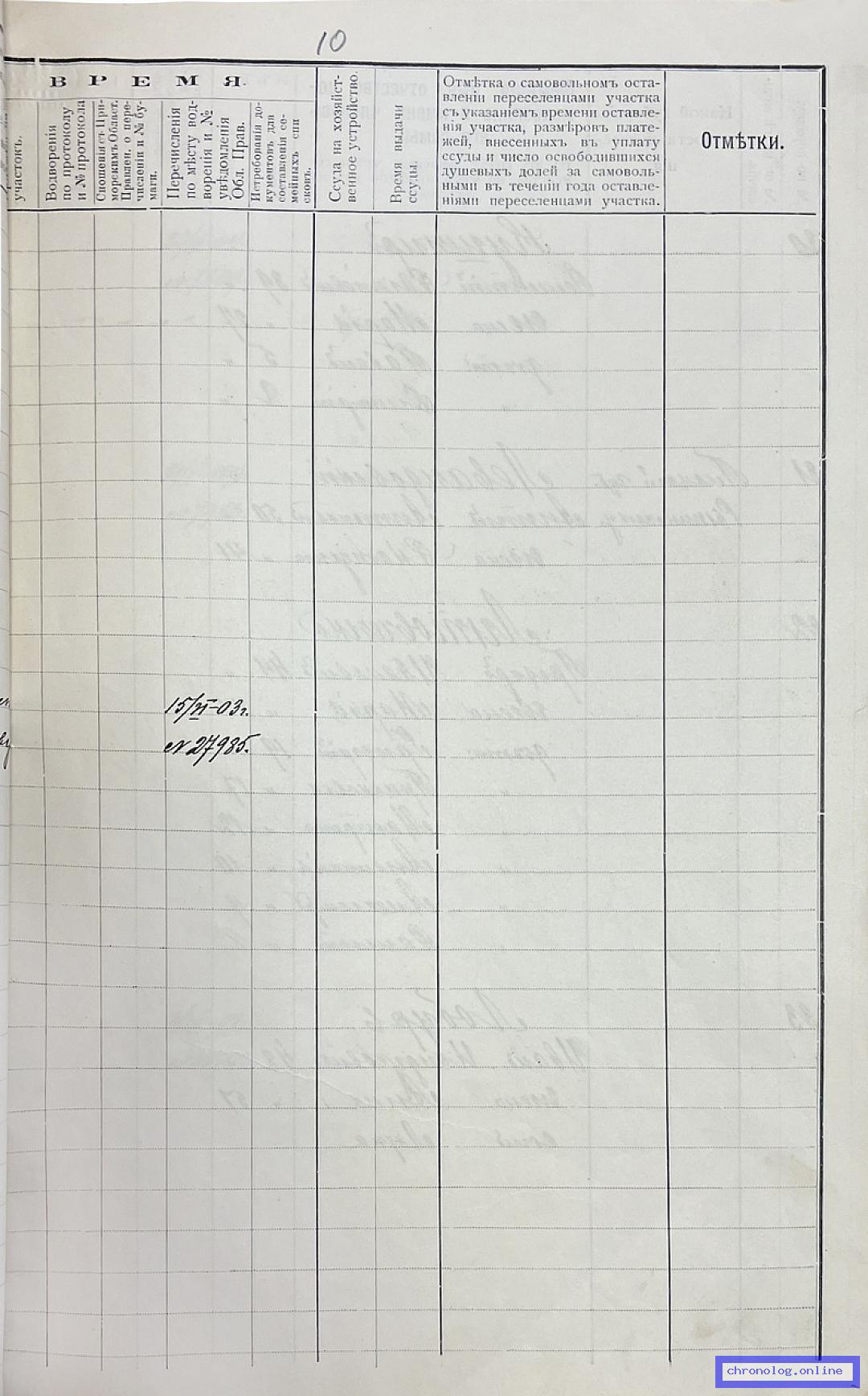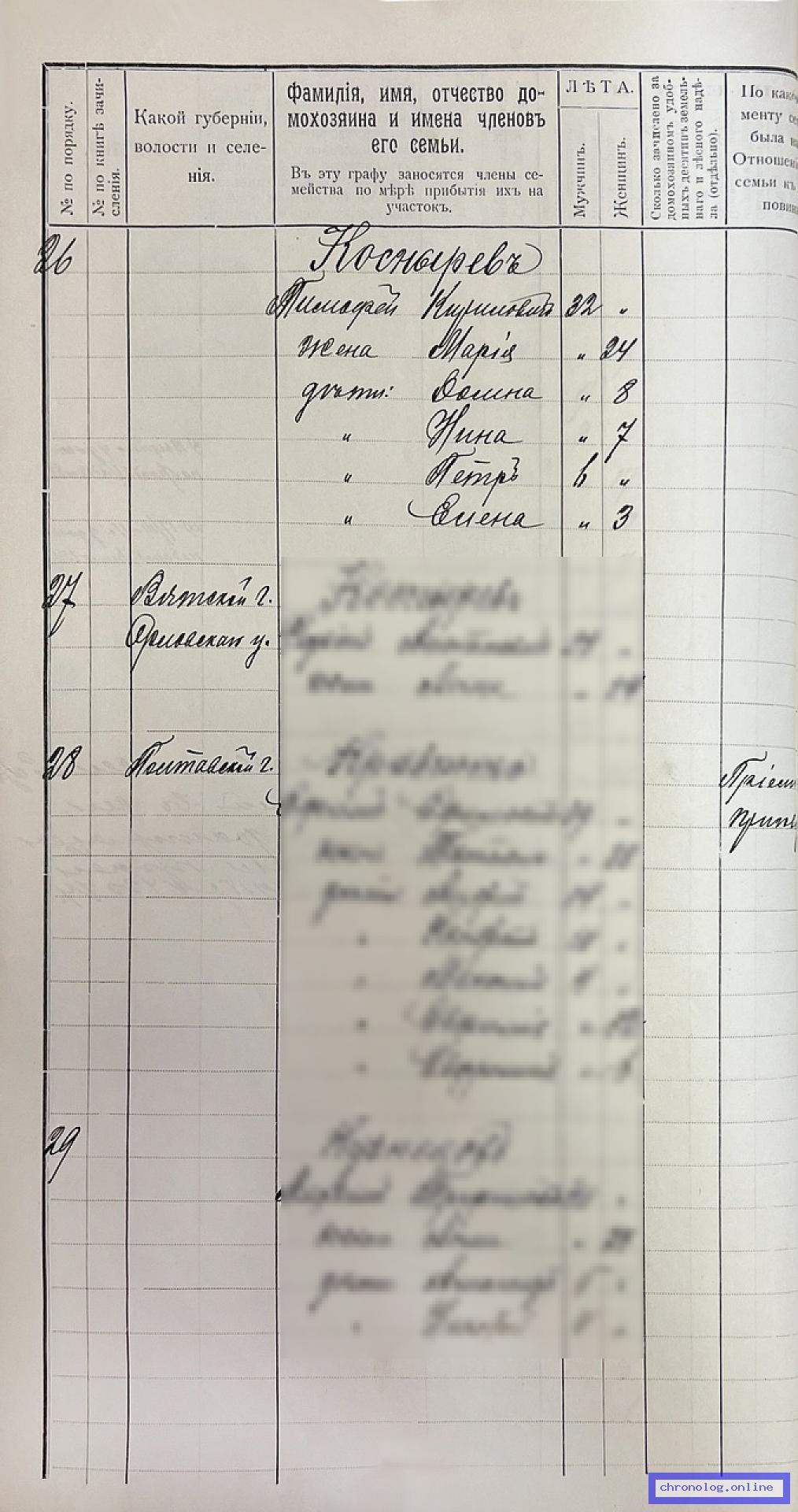 РГИАДВ 125-1-3, Л.9об.,10 (Книга регистрации переселенцев, водворённых на участок Воронежский Николо-Александровской волости ): Тимофей Кириллович Коснырев 32 лет. Жена Мария 24 лет, дети: Домна 8 лет, Нина 7 лет, Пётр 6 лет, Елена 3 лет. Исход: деревня Стародединая Хотовической волости Климовического уезда Могилёвской губернии. Снимки: 9об, 10. | ||||