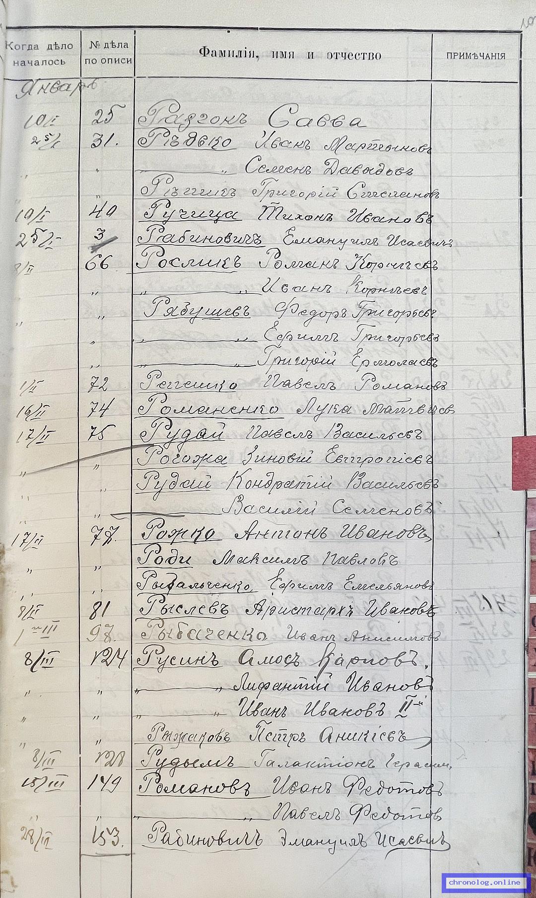 РГИАДВ 704-4-2691, Л.104об (Алфавитный список дел переселенческой части Канцелярии военного губернатора Амурской области за 1911 год): Руцынский Иван Мартемьянович показан в деле №589 от 29.11.1911 года (нумерация по старой описи, не действительная). Время и место исхода не показано. Снимки: 104об. | ||||