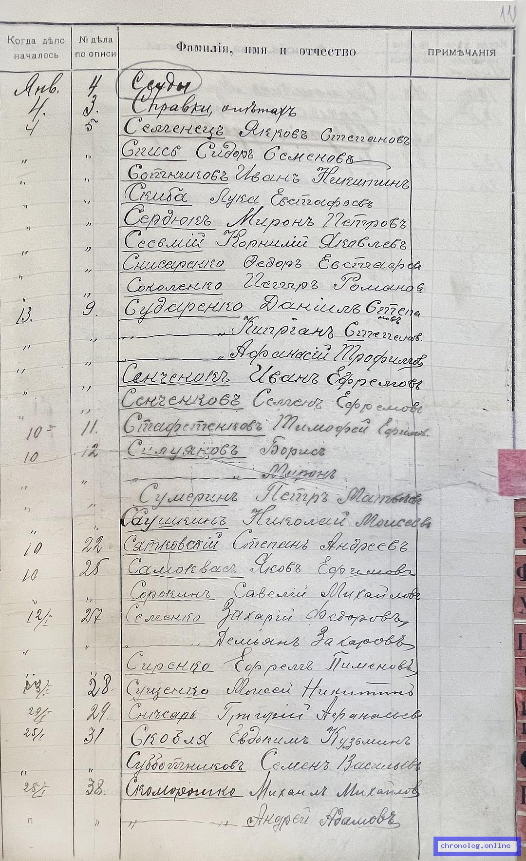 РГИАДВ 704-4-2691, Л.110 (Алфавитный список дел переселенческой части Канцелярии военного губернатора Амурской области за 1911 год): Сенченков Семён Ефремович показан в деле №9 от 13.1.1911 года (нумерация по старой описи, не действительная). Время и место исхода не показано. Снимки: 110. | ||||