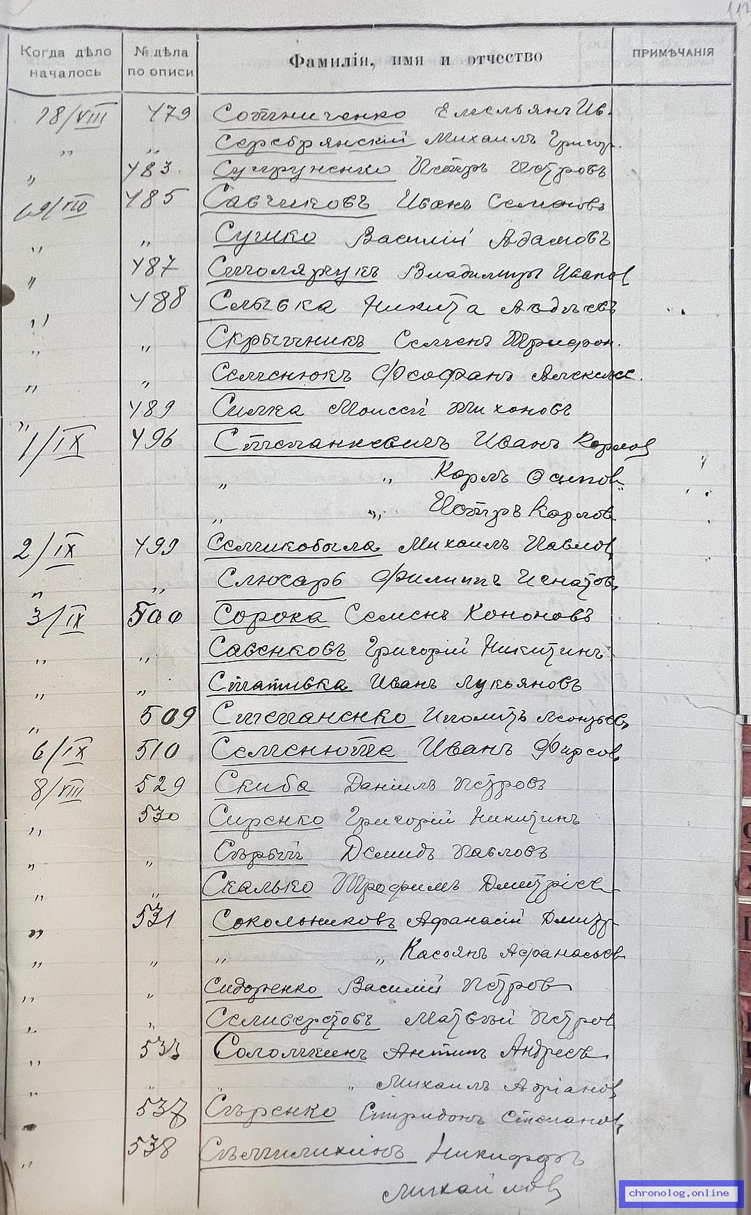 РГИАДВ 704-4-2691, Л.113 (Алфавитный список дел переселенческой части Канцелярии военного губернатора Амурской области за 1911 год): Серенко Спиридон Степанович показан в деле №537 от 8.8.1911 года (нумерация по старой описи, не действительная). Время и место исхода не показано. Снимки: 113. | ||||