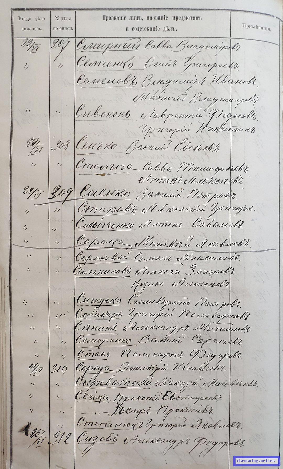 РГИАДВ 704-4-3230, Л.129об (Указатель дел переселенческой части за 1912 год): Сенько Василий Евсеевич показан со ссылкой на дело (старая опись, нумерация не действительная) №308 от 22.6.1912. Время и место исхода не показано. Снимки: 129об. | ||||