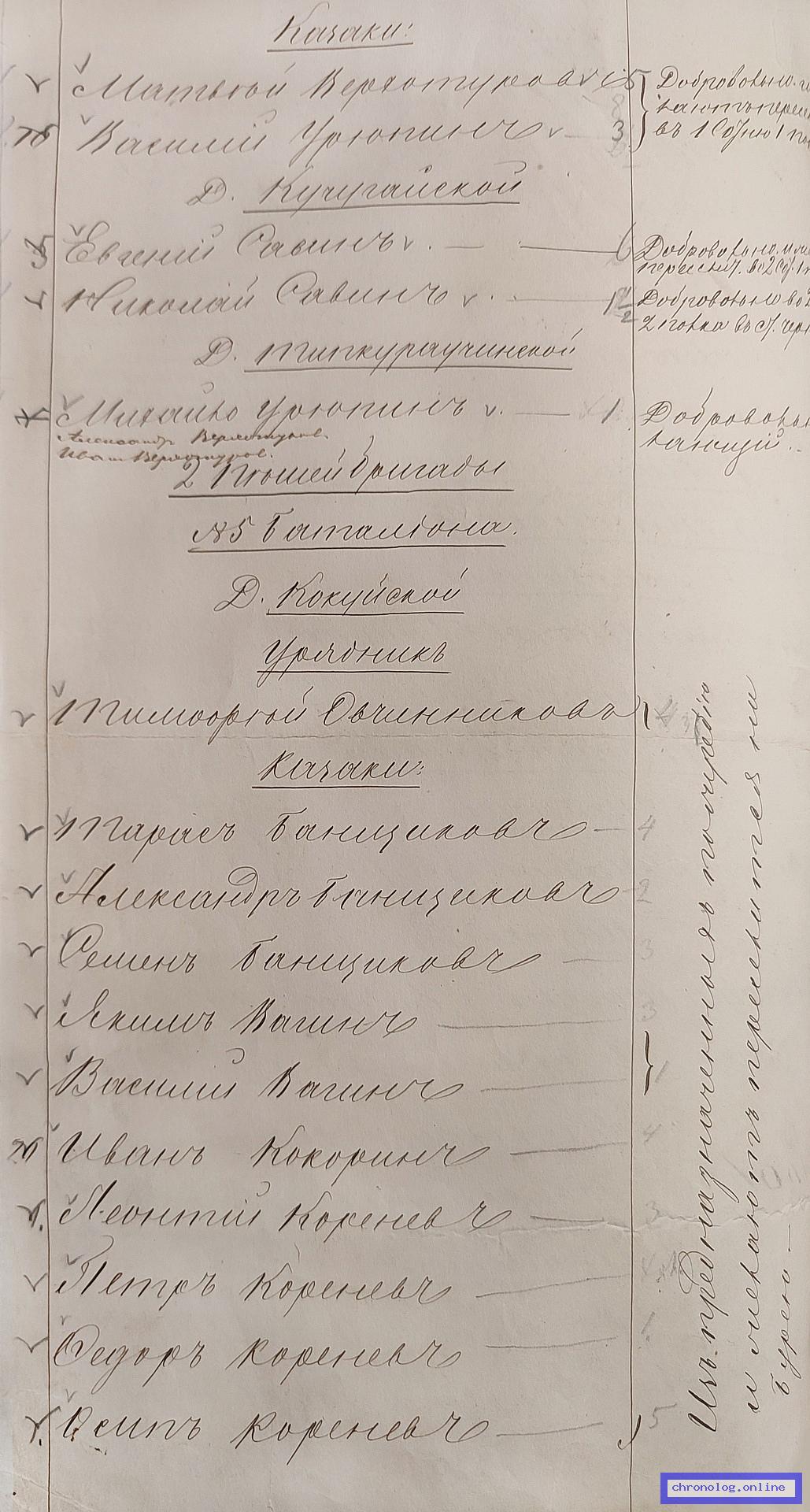Известно, что: Рогожа Зиновий Евтропиевич показан в деле №75 от 17.2.1911 года (РГИАДВ 704-4-2691, Л.103 "Алфавитный список дел переселенческой части Канцелярии военного губернатора Амурской области за 1911 год"). Необходимо выяснить: Нужно выяснить номер дела в новой описи и сделать снимки посемейного списка семьи Зиновия. Предполагаемые архивы для поиска: РГИАДВ (Владивосток). | ||||