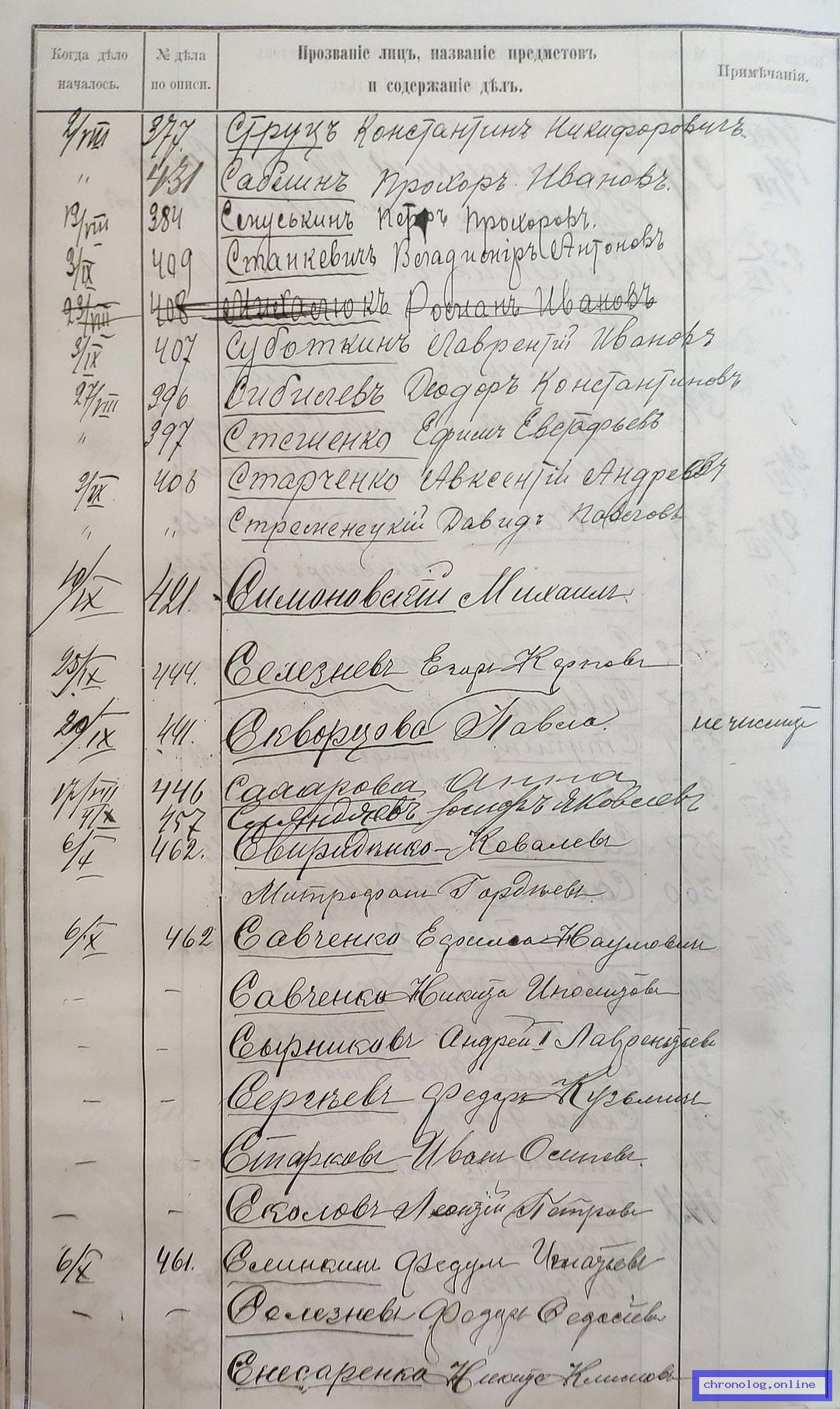 РГИАДВ 704-4-3230, Л.130об (Указатель дел переселенческой части за 1912 год): Сахарова Анна показан со ссылкой на дело (старая опись, нумерация не действительная) №446 от 17.8.1912. Время и место исхода не показано. Снимки: 130об. | ||||