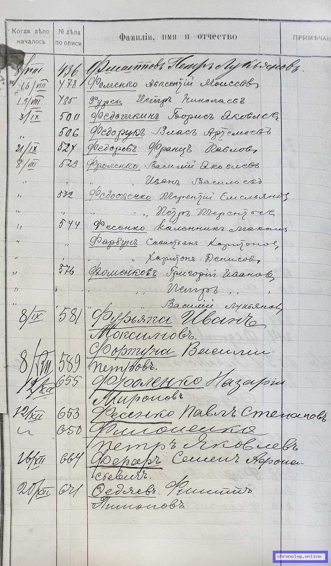 РГИАДВ 704-4-2691, Л.131об (Алфавитный список дел переселенческой части Канцелярии военного губернатора Амурской области за 1911 год): Фесенко Павел Степанович показан в деле №653 от 12.12.1911 года (нумерация по старой описи, не действительная). Время и место исхода не показано. Снимки: 131об. | ||||