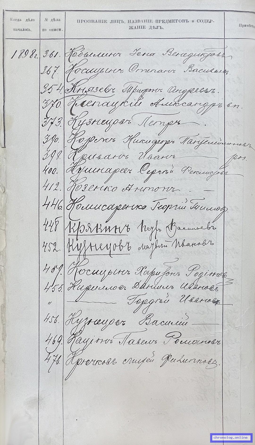 РГИАДВ 704-4-727, Л.14об (Алфавитный список ревизских дел 4-го стола за 1898 год ): Косицын Степан Васильевич показан со ссылкой на дело №367 (старая опись, нумерация не действительная) за 1898 год. Время и место исхода не показано. Снимки: 14об. | ||||