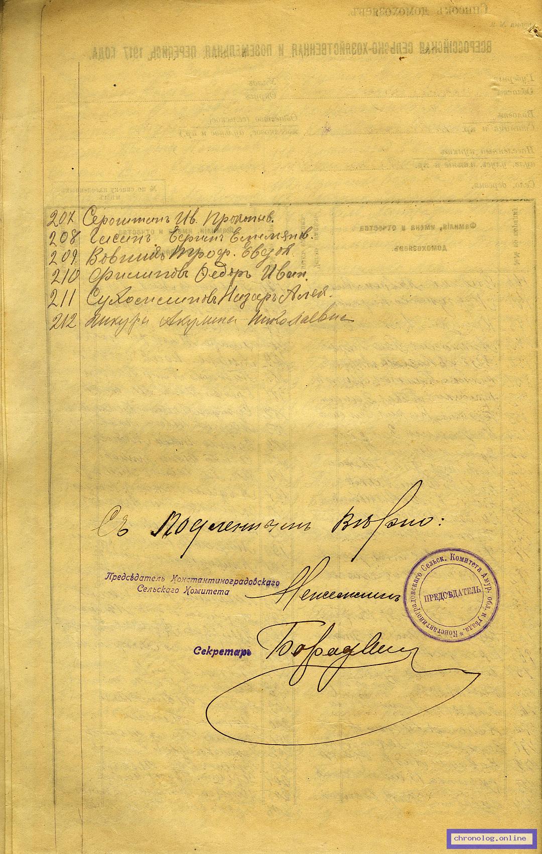 РГИАДВ 717-2-9, Л.14 (Всероссийская сельскохозяйственная и поземельная перепись 1917 года. Список домохозяев с. Константиноградовка): Под номером 62 показан Петренко Козьма Мих. Время и место исхода не показано. Снимки: 14. | ||||