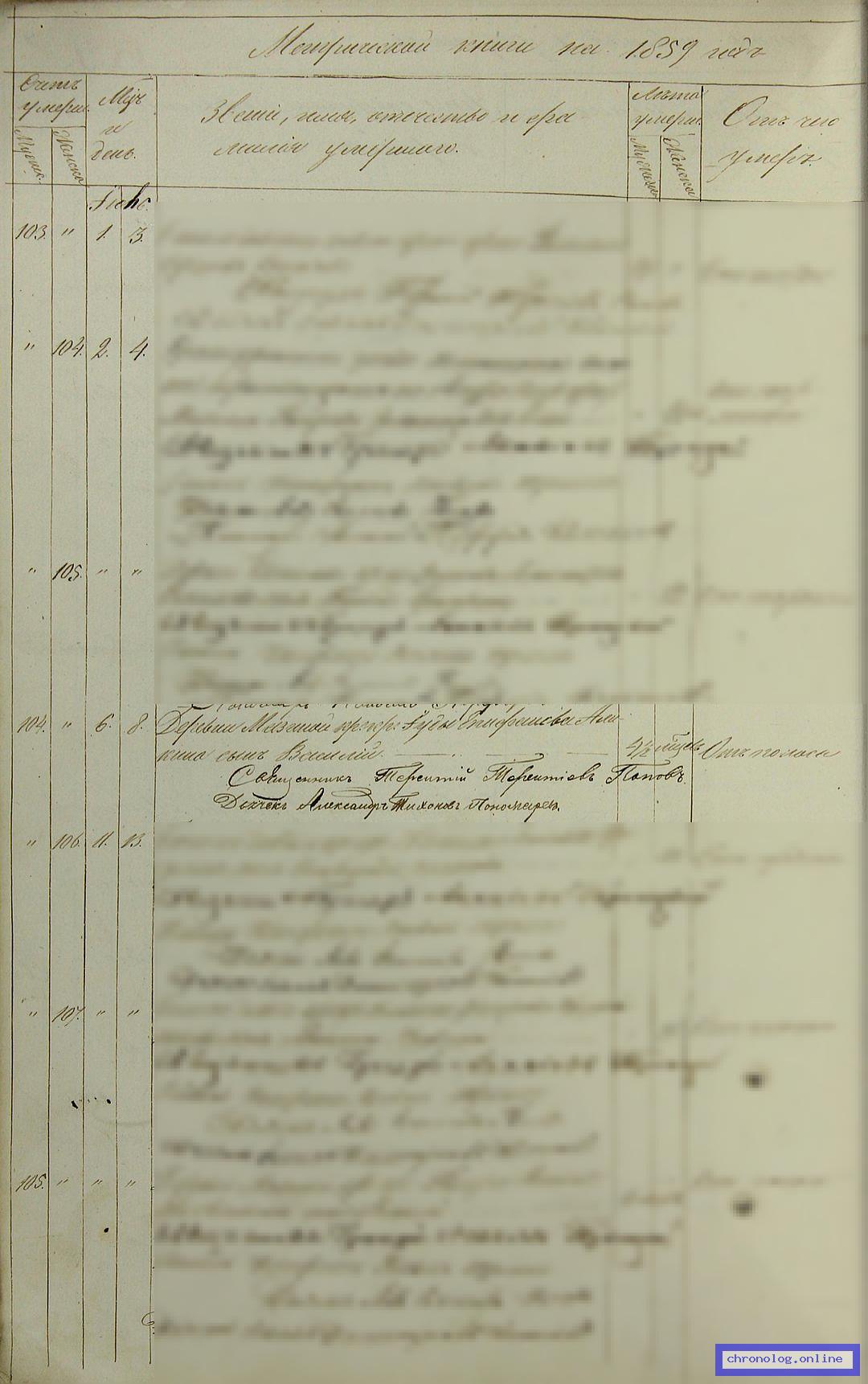 ГАСО 6-1-170, Л.152об., 153 (Метрическая книга Троицкой церкви Билимбаевского Завода за 1859 год): Запись 104 (часть 3). 6/8 июля 1859 года крепостного крестьянина деревни Мазиной Иуды Епифанова Аликина сын Василий в возрасте 4 ½ месяцев от поноса. Священник Терентий Терентиев Попов и дьячек Александр Дмитриев Пономарев. Время и место исхода не показано. Снимки: 152об. | ||||
