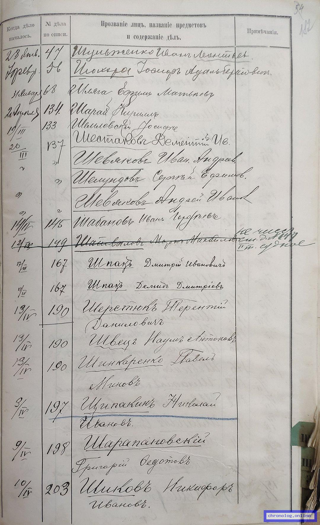 РГИАДВ 704-4-3230, Л.182 (Указатель дел переселенческой части за 1912 год): Шляга Ефим Матвеевич показан со ссылкой на дело (старая опись, нумерация не действительная) №68 от 31.1.1912. Время и место исхода не показано. Снимки: 182. | ||||