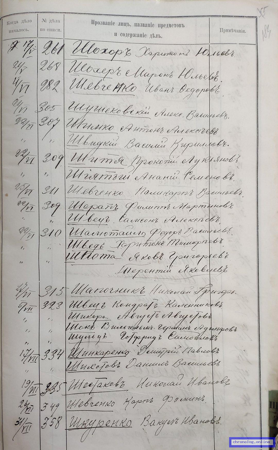 РГИАДВ 704-4-3230, Л.183 (Указатель дел переселенческой части за 1912 год): Шевченко Иван Фёдорович показан со ссылкой на дело (старая опись, нумерация не действительная) №282 от 4.6.1912. Время и место исхода не показано. Снимки: 183. | ||||