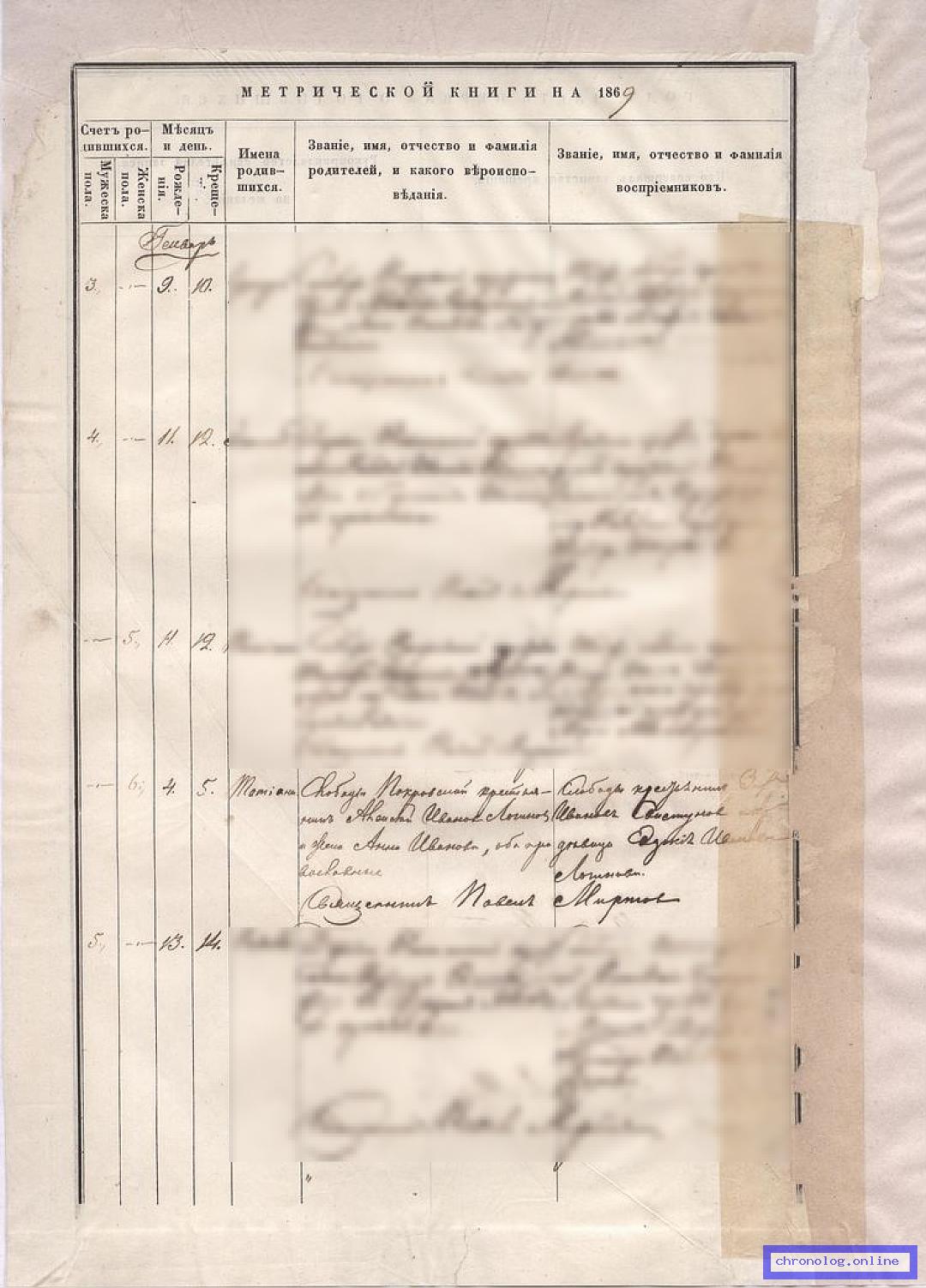 ГАТюмО 177-1-109, Л.2об., 3 (Метрическая книга Богородицкой церкви за 1869 год): Запись №6ж. Татьяна родилась/крещена *04(05).01.1869. Родители крестьянин Алексей Иванович Логинов и Анна Ивановна. Восприемники крестьяне Захар Иванович Свистунов и Евдокия Ивановна Логинова. Священник Павел Мартов. Время и место исхода не показано. Снимки: 2об, 3. | ||||