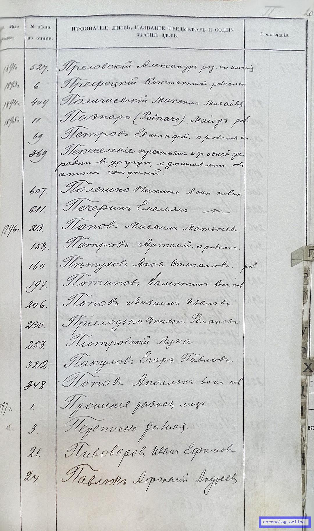 РГИАДВ 704-4-727, Л.20 (Алфавитный список ревизских дел 4-го стола за 1898 год ): Петров Артемий показан со ссылкой на дело №158 (старая опись, нумерация не действительная) за 1896 год о розыске. Время и место исхода не показано. Снимки: 20. | ||||