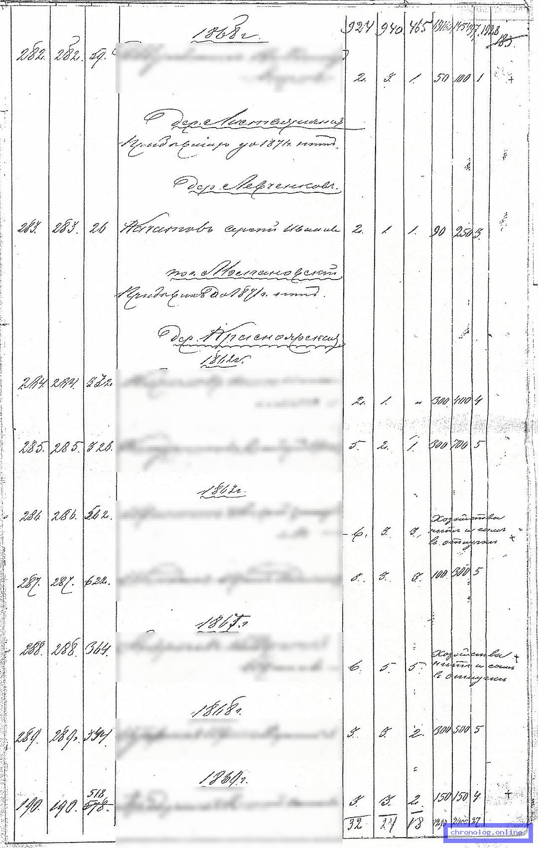 РГИАДВ 746-1-36, Л.39 (Именные списки крестьян и сведения о имеющейся земле за 1896 год): В сводной таблице о посевах пшеницы, ярицы, ячменя, овса, гречи и проса показан Вшивков Максим из села Павловского. Время и место исхода не показано. Снимки: 39. | ||||