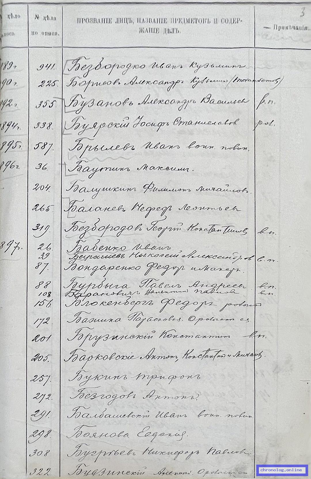РГИАДВ 704-4-727, Л.3 (Алфавитный список ревизских дел 4-го стола за 1898 год ): Бажика Парасковия показан со ссылкой на дело №172 (старая опись, нумерация не действительная) за 1897 год о розыске. Время и место исхода не показано. Снимки: 3. | ||||