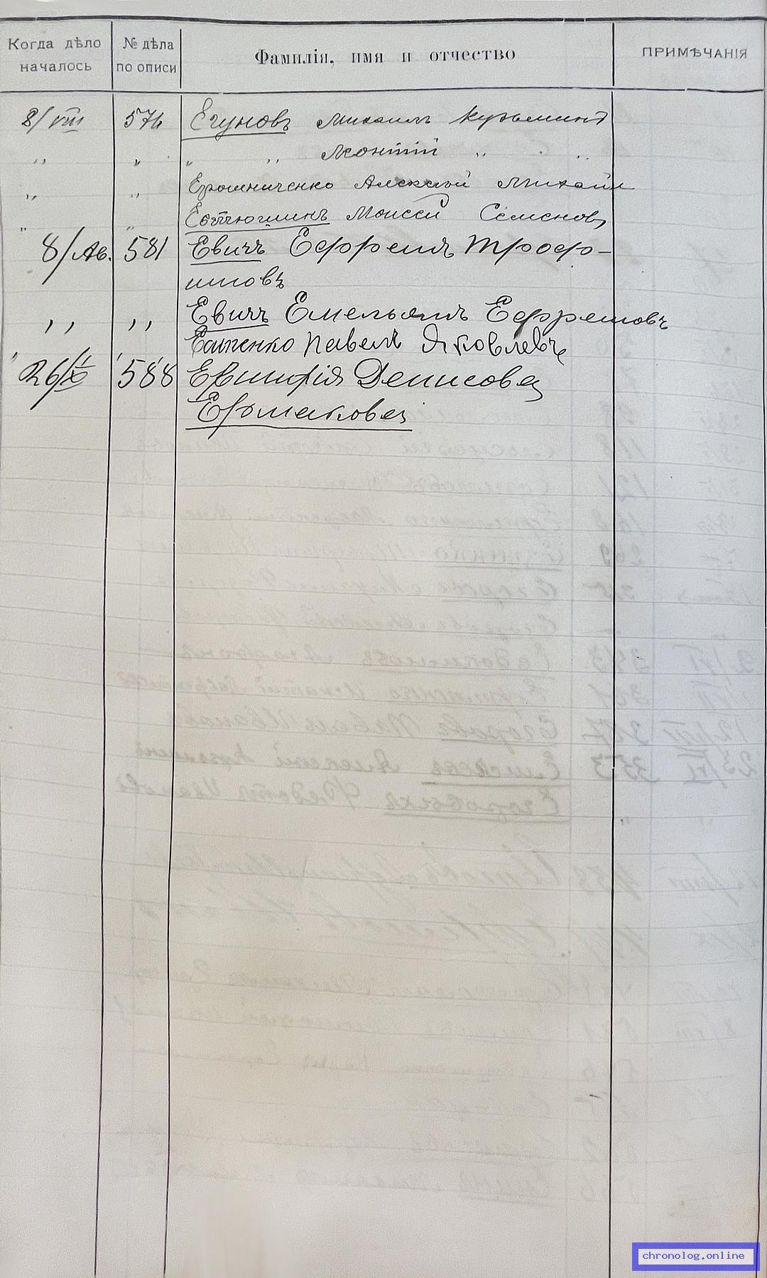 РГИАДВ 704-4-2691, Л.30об (Алфавитный список дел переселенческой части Канцелярии военного губернатора Амурской области за 1911 год): Есипенко Павел Яковлевич показан в деле №581 от 8.8.1911 года (нумерация по старой описи, не действительная). Время и место исхода не показано. Снимки: 30об. | ||||