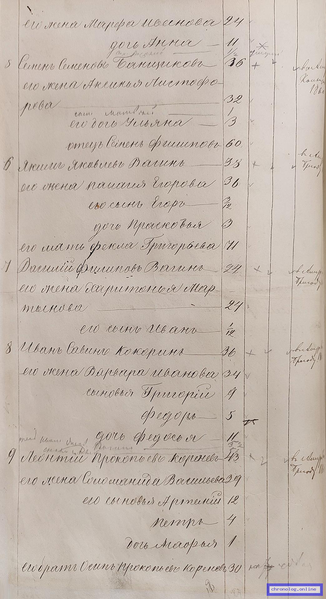 ГАЗК 30-2-270, Л.39об, 129об (Посемейные списки переселенцев на р. Амур): Казак 5-го пешего батальона Василий Филиппович Вагин 24 жена его Харитонья Мартынова 24 сын Иван 1 месяц. Исход: деревня Кокуйская Нерчинского уезда. Снимки: 39об, 129об. | ||||