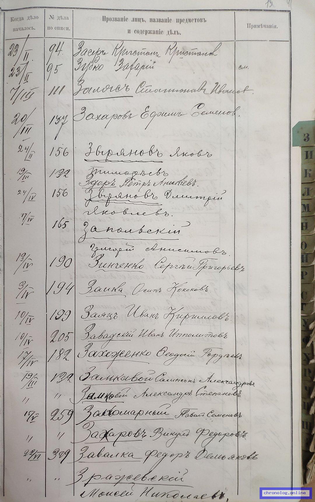 РГИАДВ 704-4-3230, Л.41 (Указатель дел переселенческой части за 1912 год): Заяц Иван Кириллович показан со ссылкой на дело (старая опись, нумерация не действительная) №199 от 10.4.1912. Время и место исхода не показано. Снимки: 41. | ||||