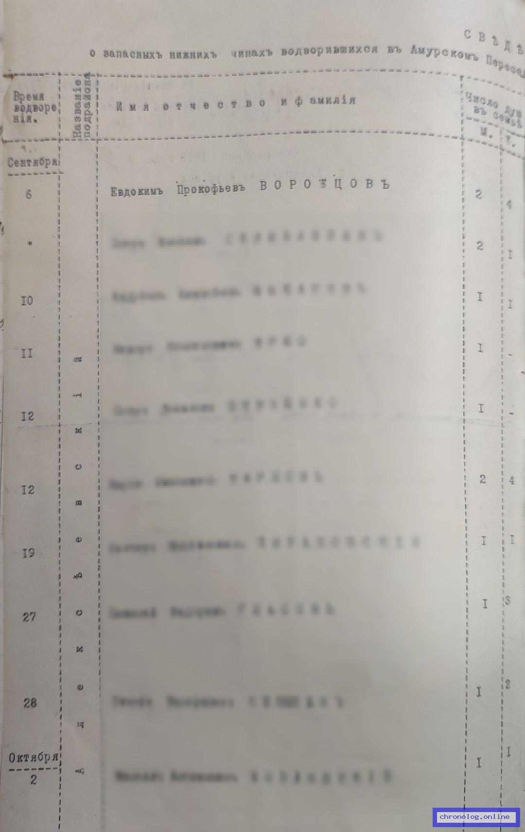 РГИАДВ 704-4-3228, Л.42об.-43 (Списки запасных солдат армии и флота, переселившихся в Амурскую область за 1912 год): Запасной нижний чин 101 пехотного Пермского полка Евдоким Прокофьевич Ворожцов с семьёй водворён 06.09.1912 на участок Алексеевский. Исход: село Сенжа Ирмучатской волости Уржумского уезда Вятской области. Снимки: 42об, 43. | ||||