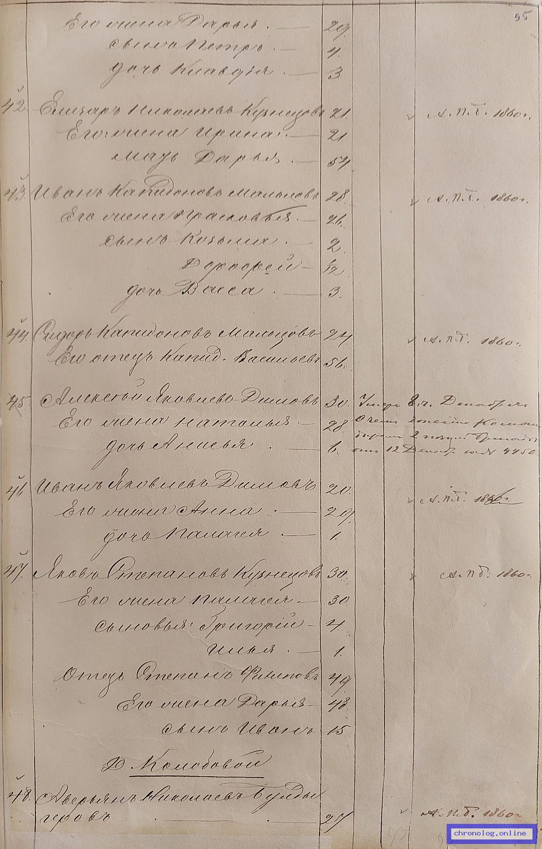 РГИАДВ 793-1-419, Л.140об (Списки казакам, вахмистрам, урядникам Амурского казачьего войска по возрастам, разрядам и округам на 1900 год): Младший урядник Павел Матвеевич Глотов 43 лет из станицы Екатерининской показан в списке неспособных по Екатерининскому станичному округу. Время и место исхода не показано. Снимки: 140об. | ||||