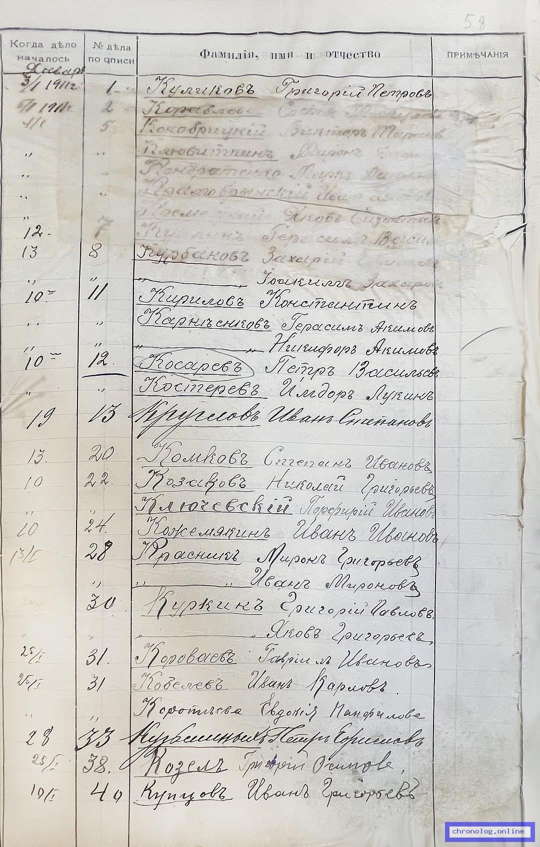 РГИАДВ 704-4-2691, Л.58 (Алфавитный список дел переселенческой части Канцелярии военного губернатора Амурской области за 1911 год): Куркин Яков Григорьевич показан в деле №30 от 20.1.1911 года (нумерация по старой описи, не действительная). Время и место исхода не показано. Снимки: 58. | ||||