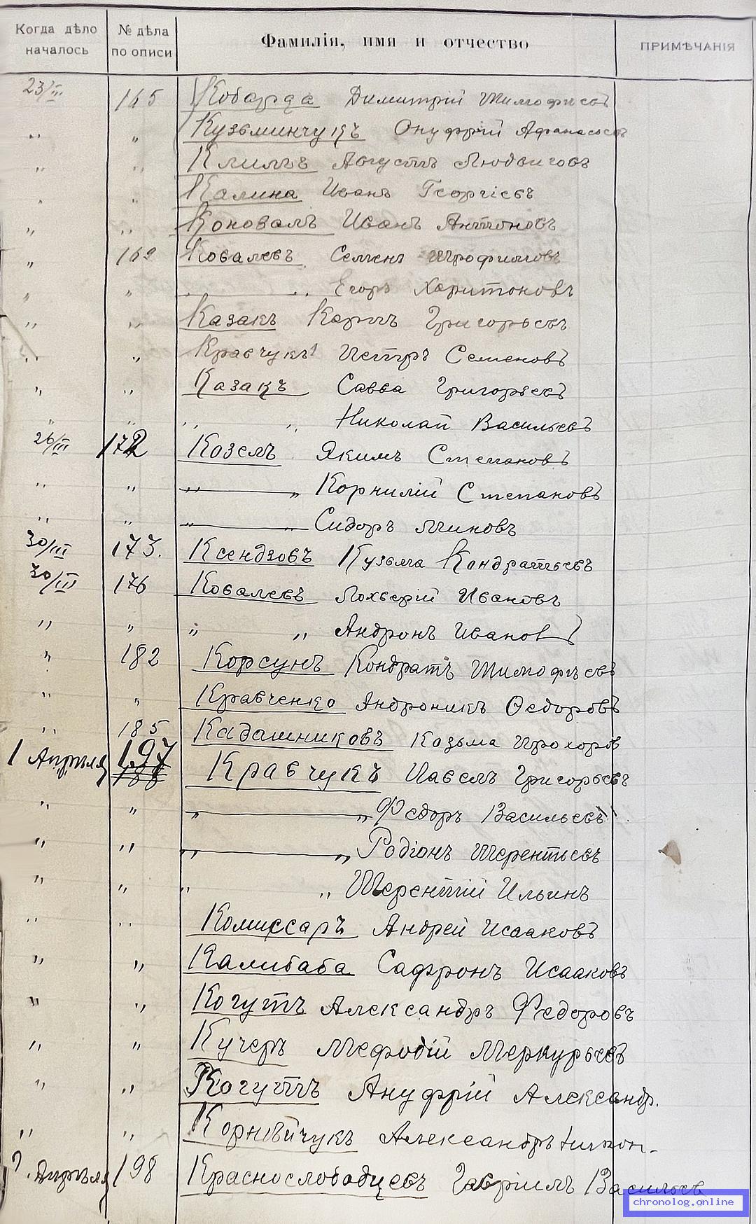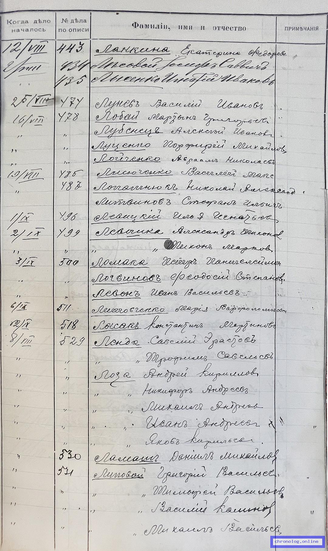 РГИАДВ 704-4-2691, Л.59об (Алфавитный список дел переселенческой части Канцелярии военного губернатора Амурской области за 1911 год): Корсун Кондрат Тимофеевич показан в деле №182 от 30.3.1911 года (нумерация по старой описи, не действительная). Время и место исхода не показано. Снимки: 59об. | ||||