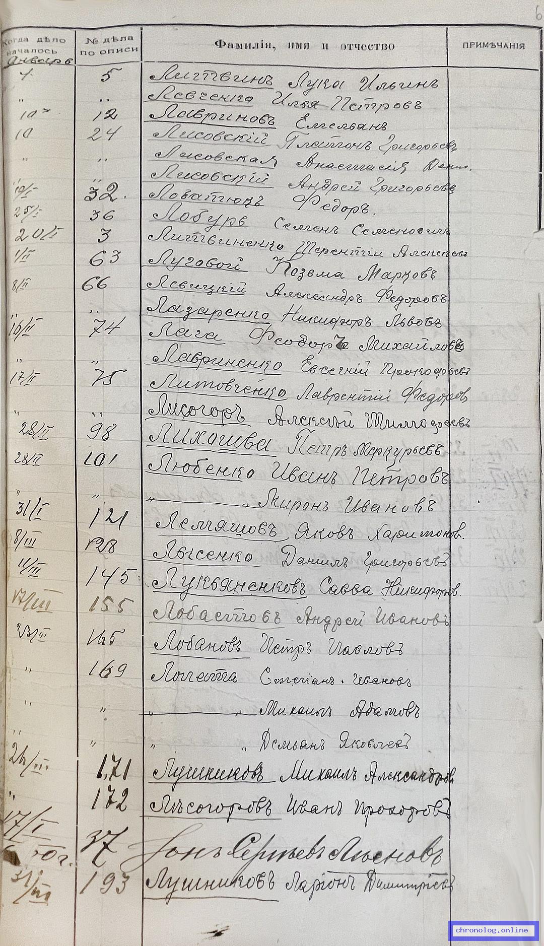 РГИАДВ 704-4-2691, Л.68 (Алфавитный список дел переселенческой части Канцелярии военного губернатора Амурской области за 1911 год): Лопата Михаил Адамович показан в деле №169 от 23.3.1911 года (нумерация по старой описи, не действительная). Время и место исхода не показано. Снимки: 68. | ||||