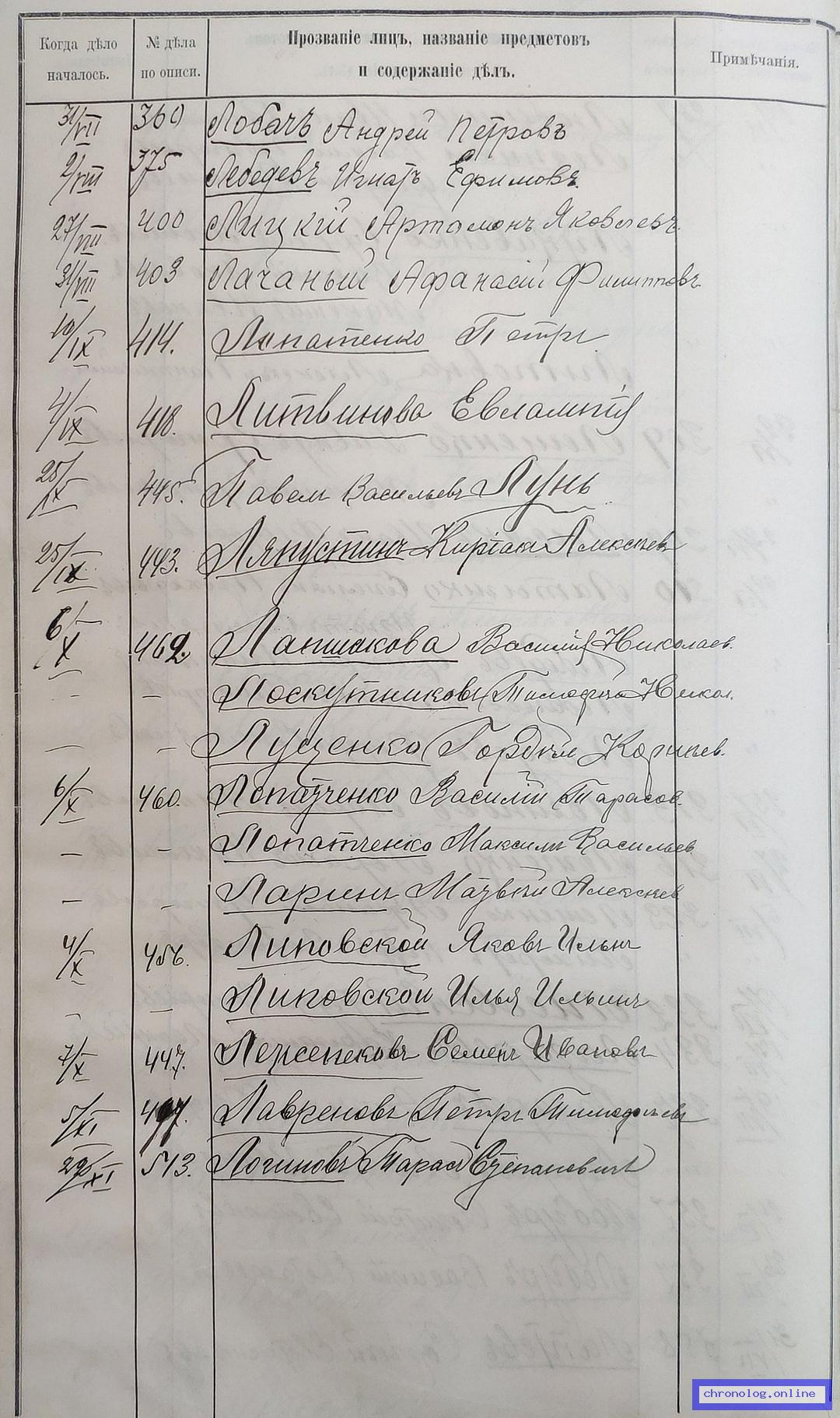 РГИАДВ 704-4-3230, Л.69об (Указатель дел переселенческой части за 1912 год): Липовский Илья Ильевич показан со ссылкой на дело (старая опись, нумерация не действительная) №456 от 4.10.1912. Время и место исхода не показано. Снимки: 69об. | ||||