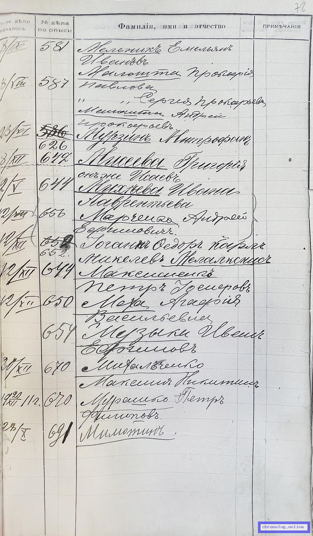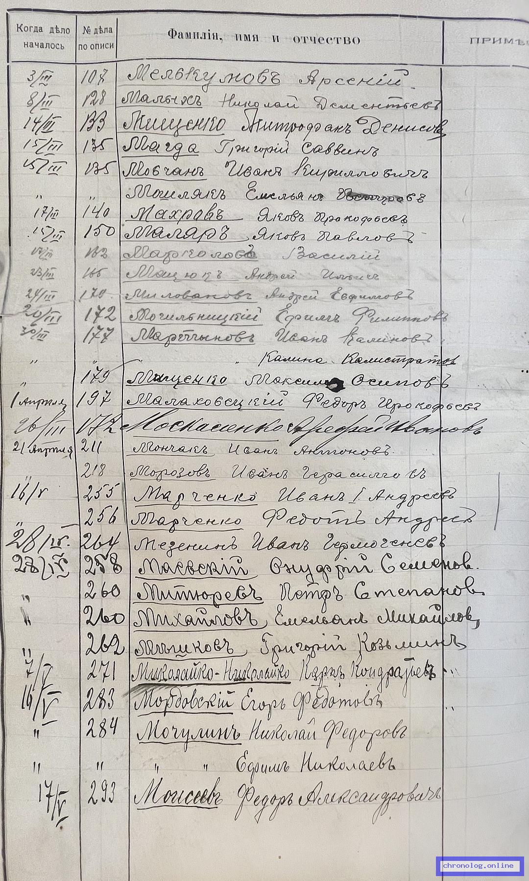 РГИАДВ 704-4-2691, Л.75об (Алфавитный список дел переселенческой части Канцелярии военного губернатора Амурской области за 1911 год): Мовчан Иван Кириллович показан в деле №135 от 15.3.1911 года (нумерация по старой описи, не действительная). Время и место исхода не показано. Снимки: 75об. | ||||