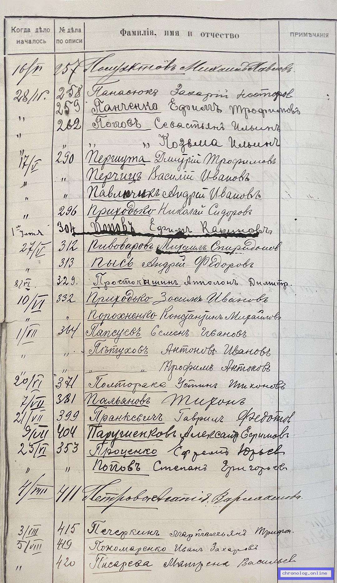 РГИАДВ 704-4-2691, Л.97об (Алфавитный список дел переселенческой части Канцелярии военного губернатора Амурской области за 1911 год): Попов Степан Григорьевич показан в деле №353 от 23.6.1911 года (нумерация по старой описи, не действительная). Время и место исхода не показано. Снимки: 97об. | ||||