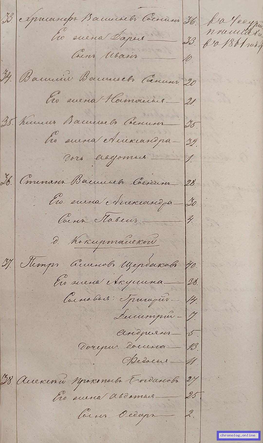 ГАЗК 30-2-270, Л.112, 241об (Посемейные списки переселенцев на р. Амур): Казак 11-го пешего батальона Хрисанф Васильевич Соснин 36 его жена Дарья 33 сын Иван 10. Исход: село Шивеинское Нерчинского уезда. Снимки: 112, 241об. | ||||