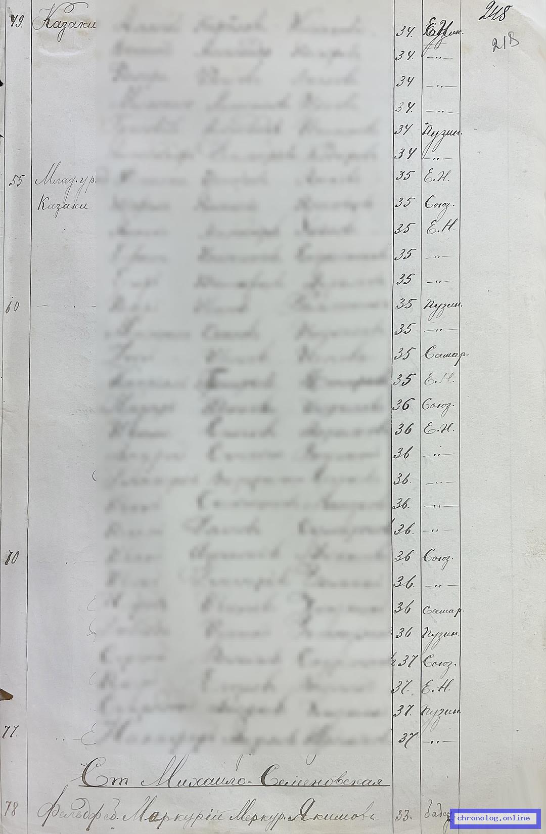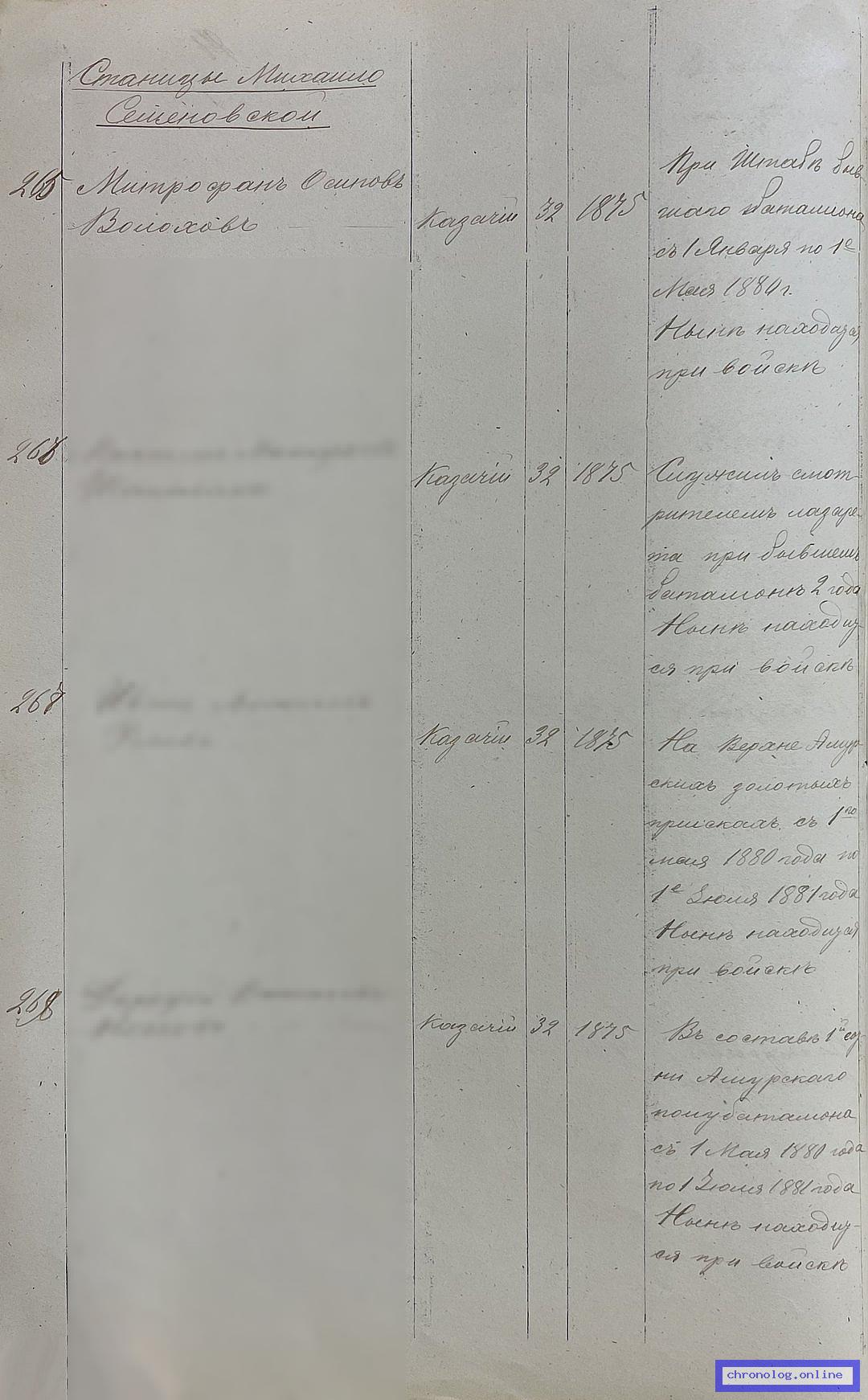 Приказы командующего Амурским пешим казачьим полубатальоном об освидетельствовании молодых казаков, производстве в следующий чин, расходовании денежных средств части и т.д. (Имеются именные списки служащих казаков полубатальона)