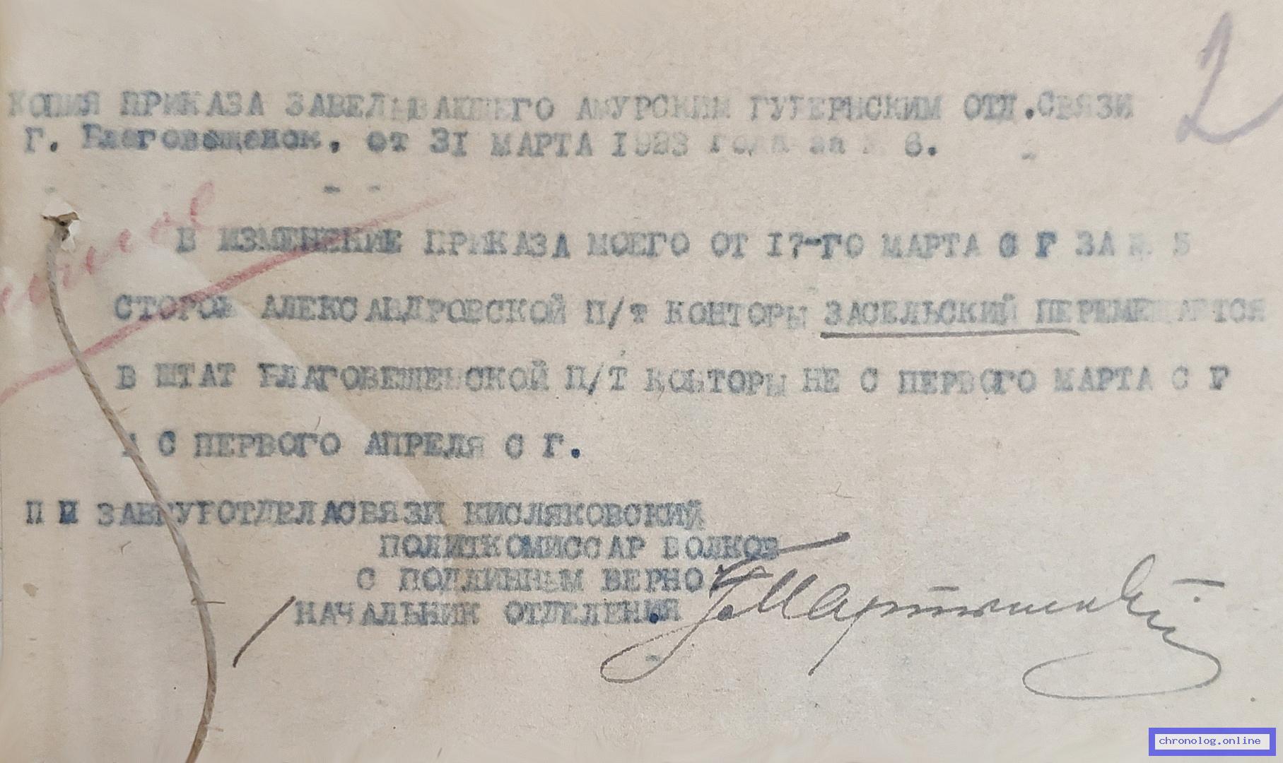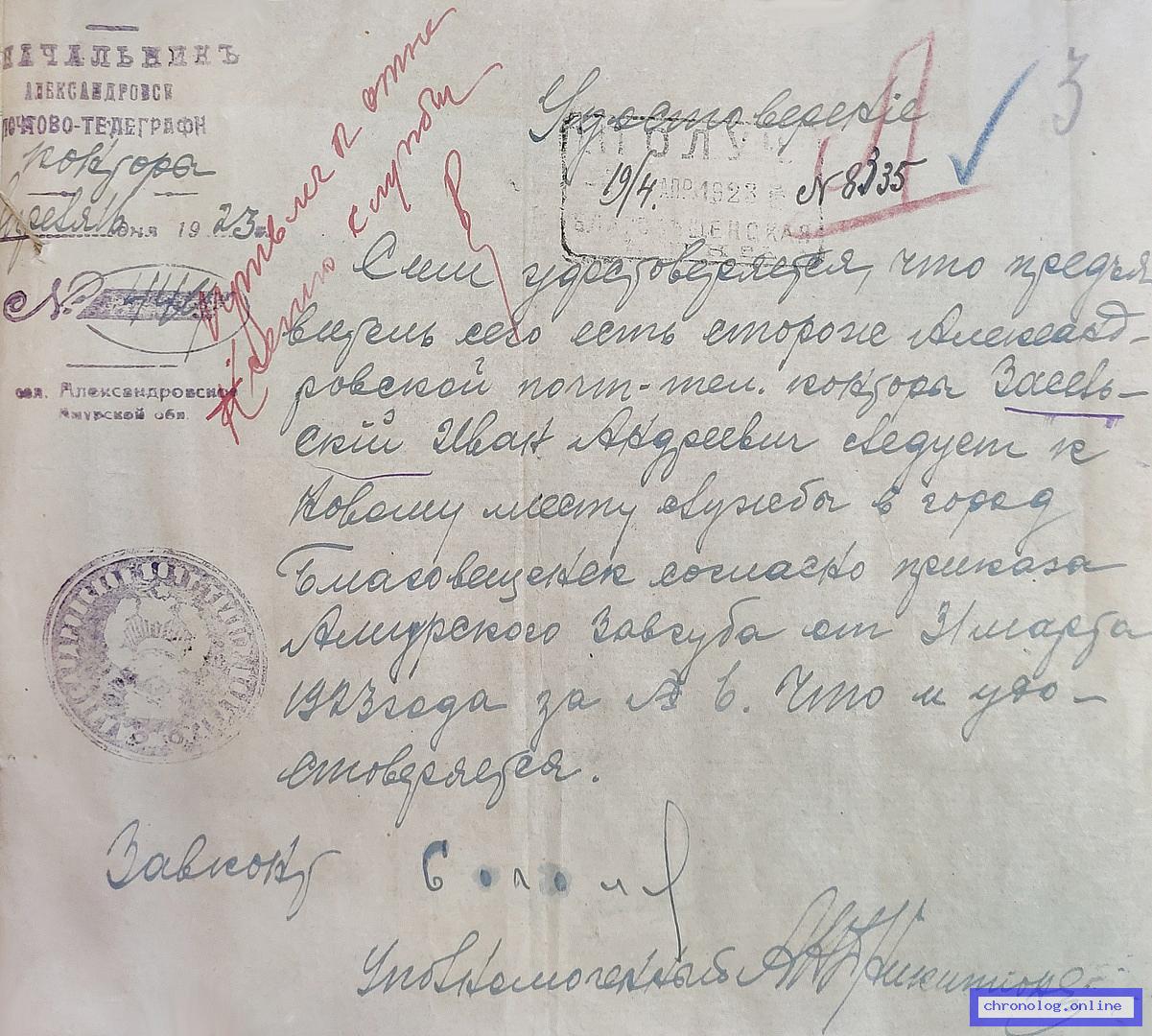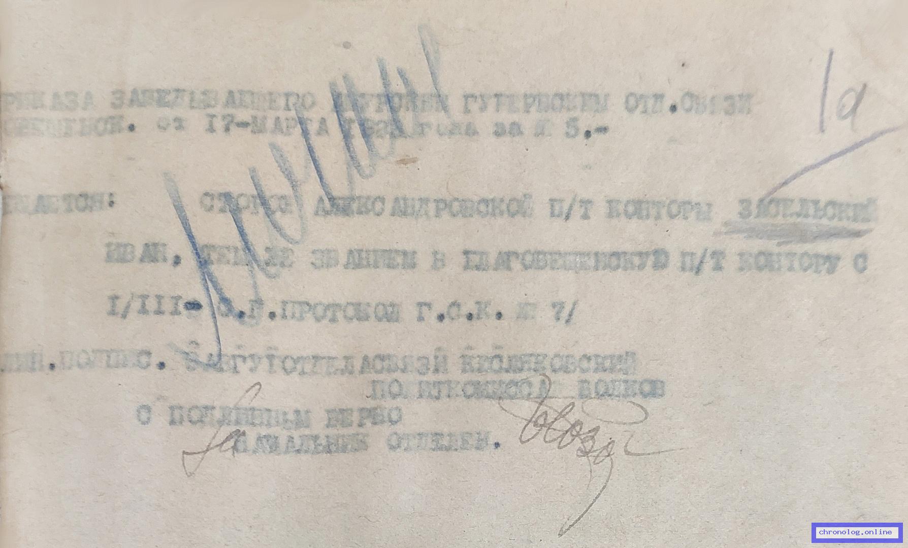 Сведения о службе почтово-телеграфного специалиста Благовещенской почтово-телеграфной конторы Алферова Г.А