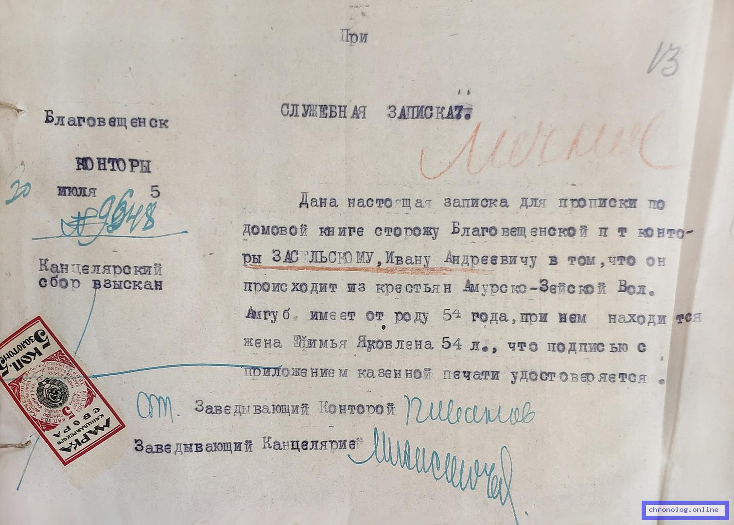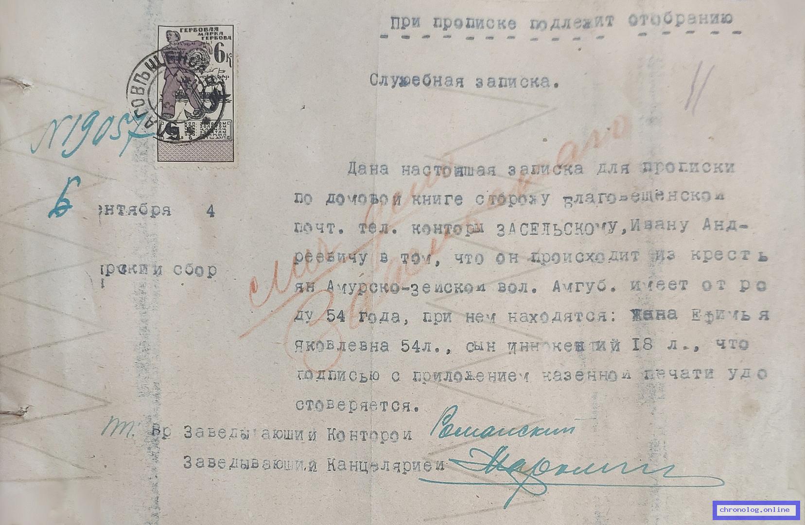 Сведения о службе почтальона Благовещенской почтово-телеграфной конторы Андросова Я.Т