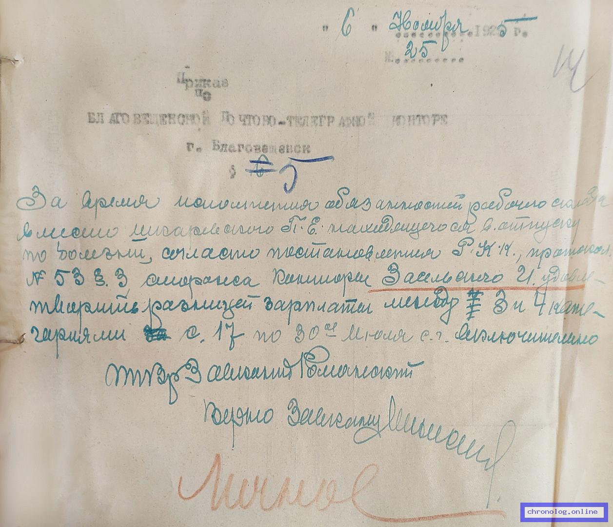 Сведения о службе почтово-телеграфного специалиста Благовещенской почтово-телеграфной конторы Аввакумова Г.А