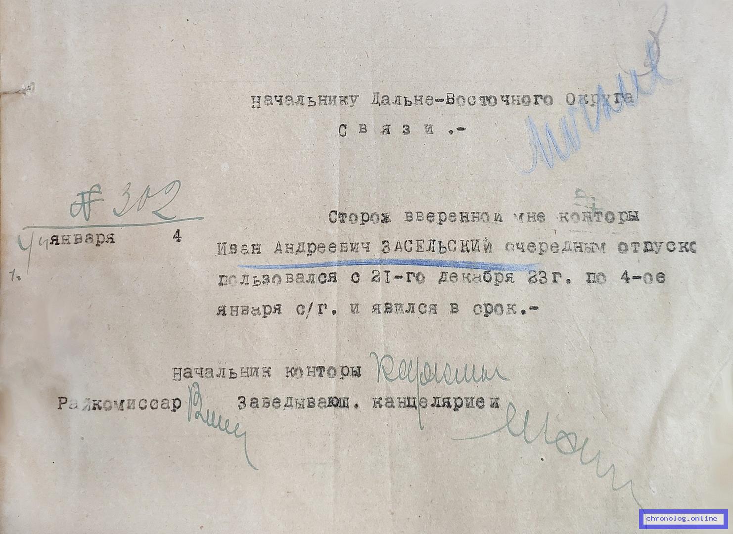 Сведения о службе почтово-телеграфного специалиста Благовещенской почтово-телеграфной конторы Аввакумова В.А