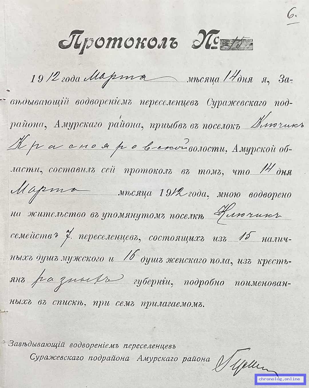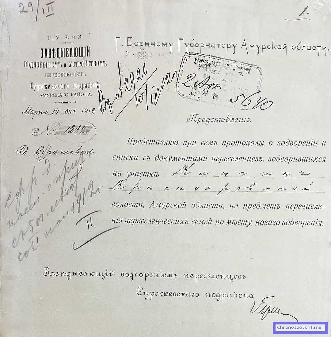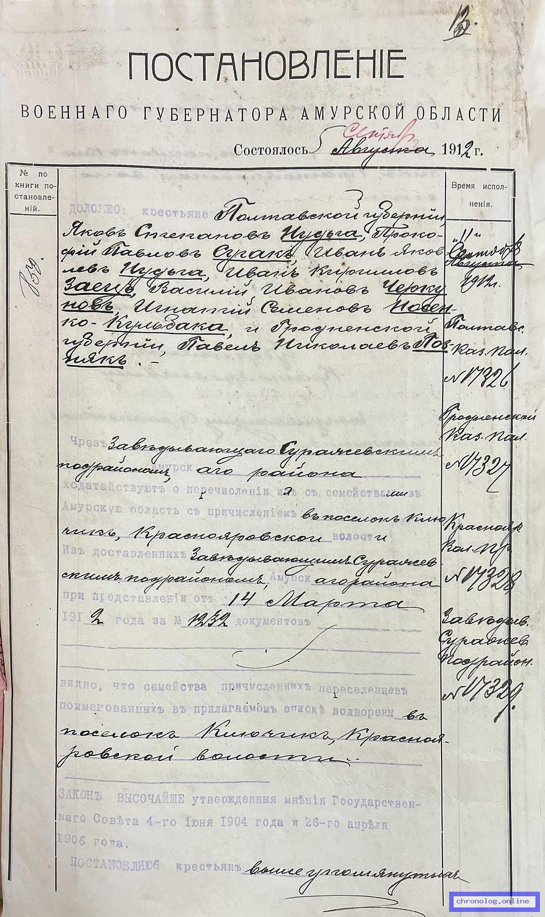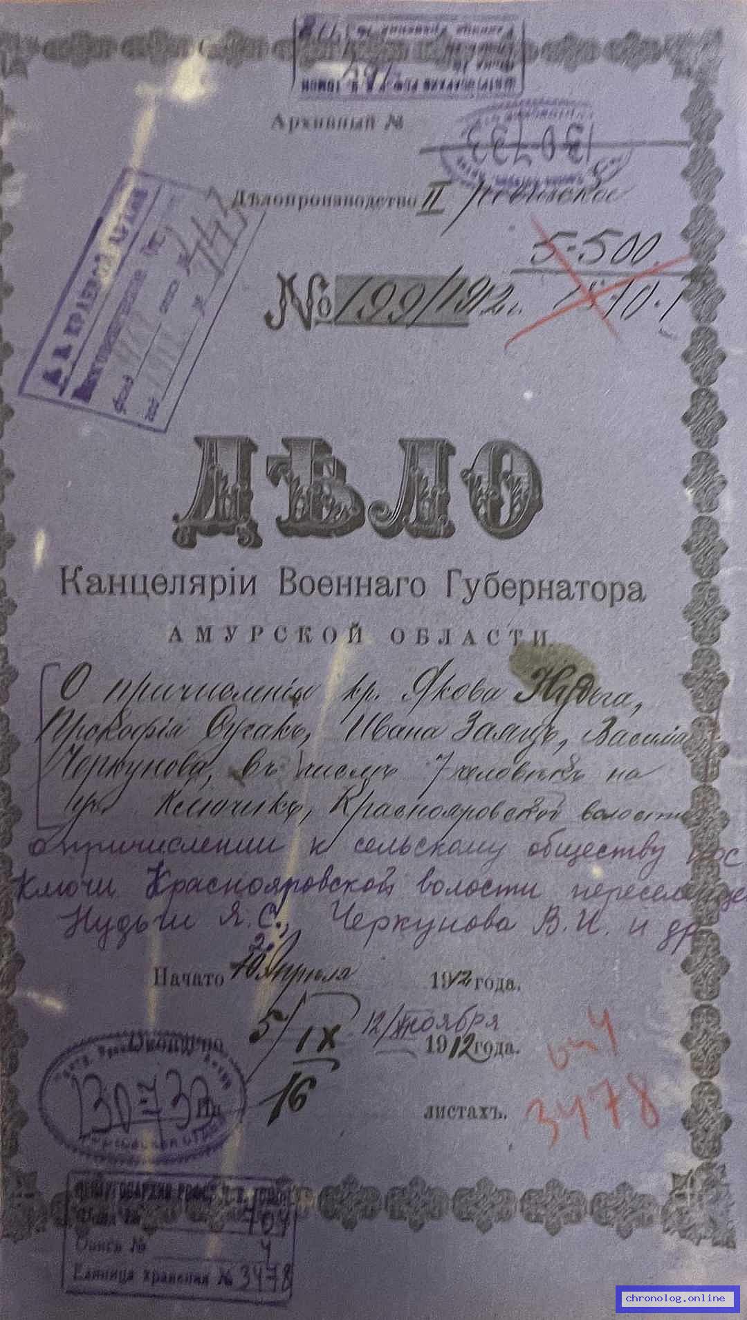 Документ 'Дело о причислении к сельскому обществу пос. Ключик Краснояровской волости переселенцев Нудьги Я.С., Черкунова В.И. и др.' (Амурская область, 2.04.1912 - 12.11.1912), число страниц: 16) представлен на платформе. Ссылка в Телеграме