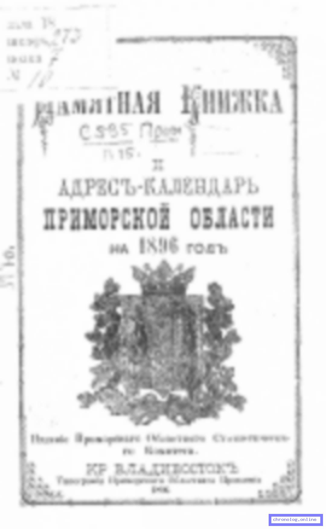 | Памятная книжка и адрес-календарь Приморской области на 1896 год | город Владивосток (Приморская область) | 1896 | ||