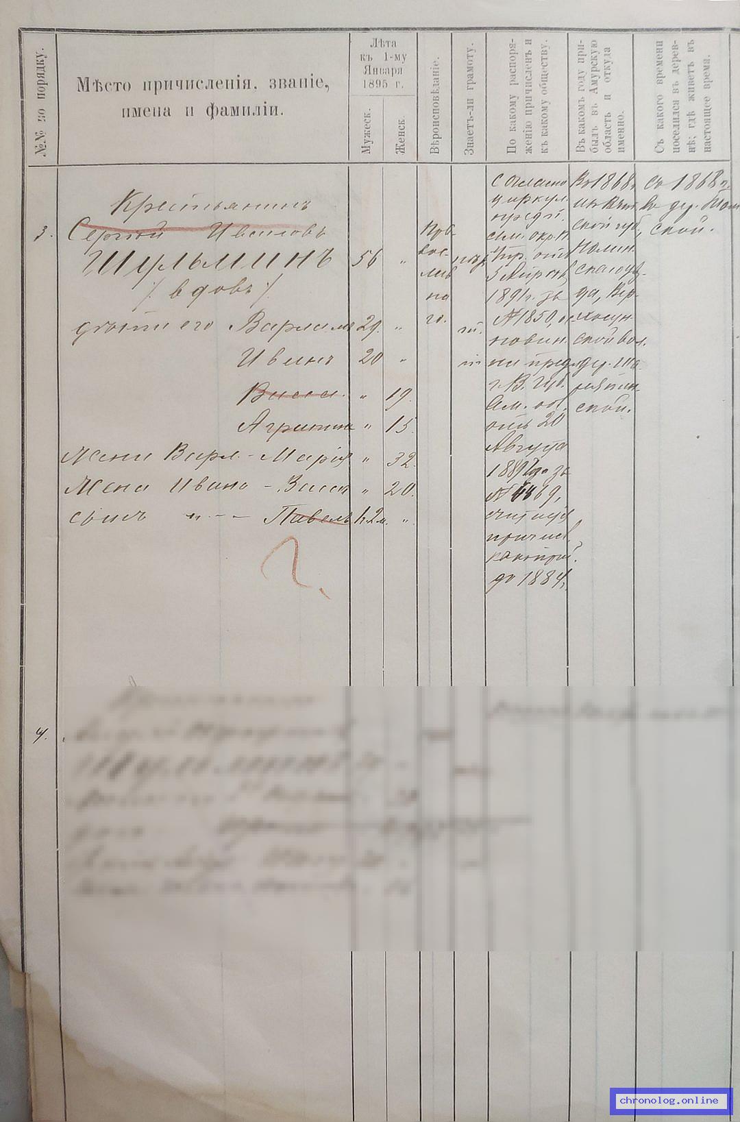 РГИАДВ 704-4-707, Л.44об., 45 (Записи переселенцев, причисленных к сословию мещан и общественных крестьян Амурской области за 1895 год): Крестьянин Сергей Иванович Шульмин 56 лет, вдов. Дети его: Варлам 29 лет, Иван 20 лет, Васса 19 лет, Агрипина 15 лет. Жена Варлама Мария 32 лет. Жена Ивана Васса 20 лет, сын их Павел 1 год 2 месяца. Исход: деревня Шаряпинская Верхосунской волости Нолинского уезда Вятской губернии. Снимки: 44об, 45. | |||