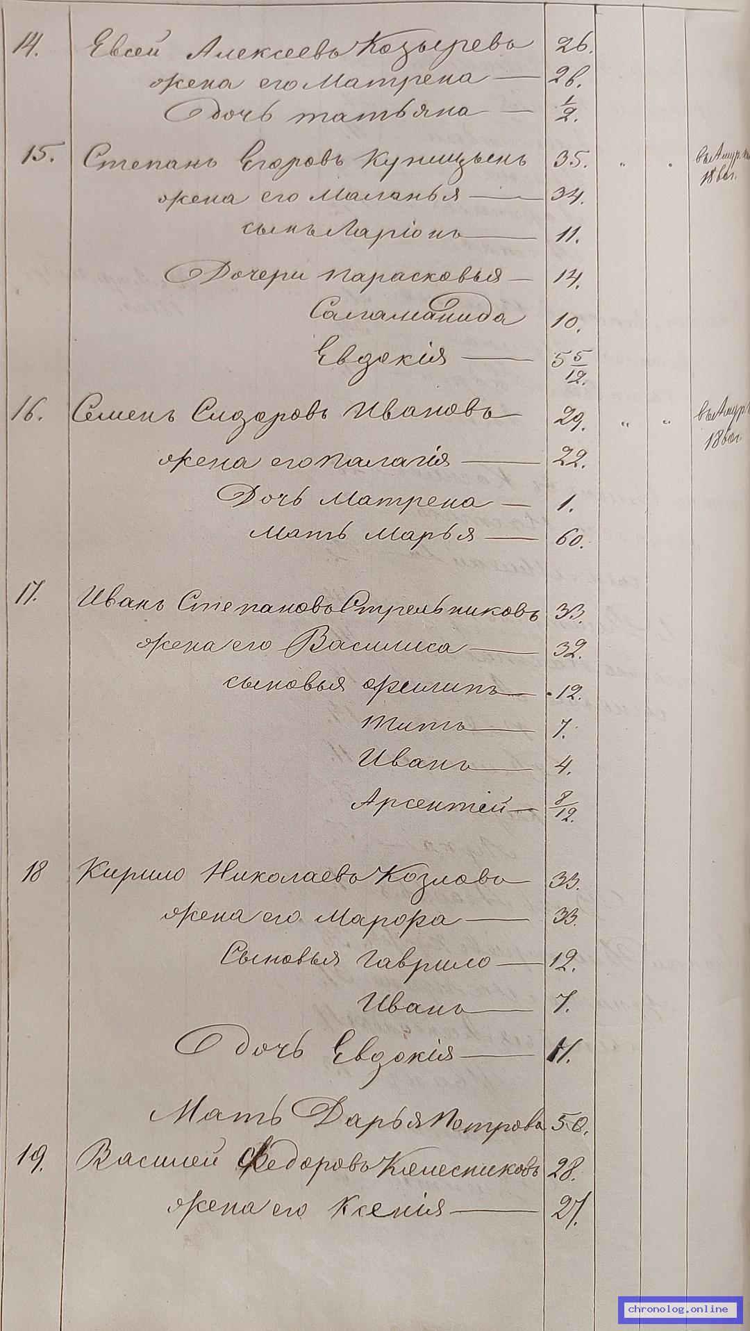 ГАЗК 30-2-270, Л.134, 249об (Посемейные списки переселенцев на р. Амур): Казак 12-го пешего батальона Ефим Мосеевич Гусевской 37 его жена Графида 35 сыновья Аникей 12 Иван 4 дочери Харинитья 6 Катерина-Первая 15 Катерина-Вторая 3 месяца. Исход: деревня Уктычинская Нерчинского уезда. Снимки: 134, 249об. | |||