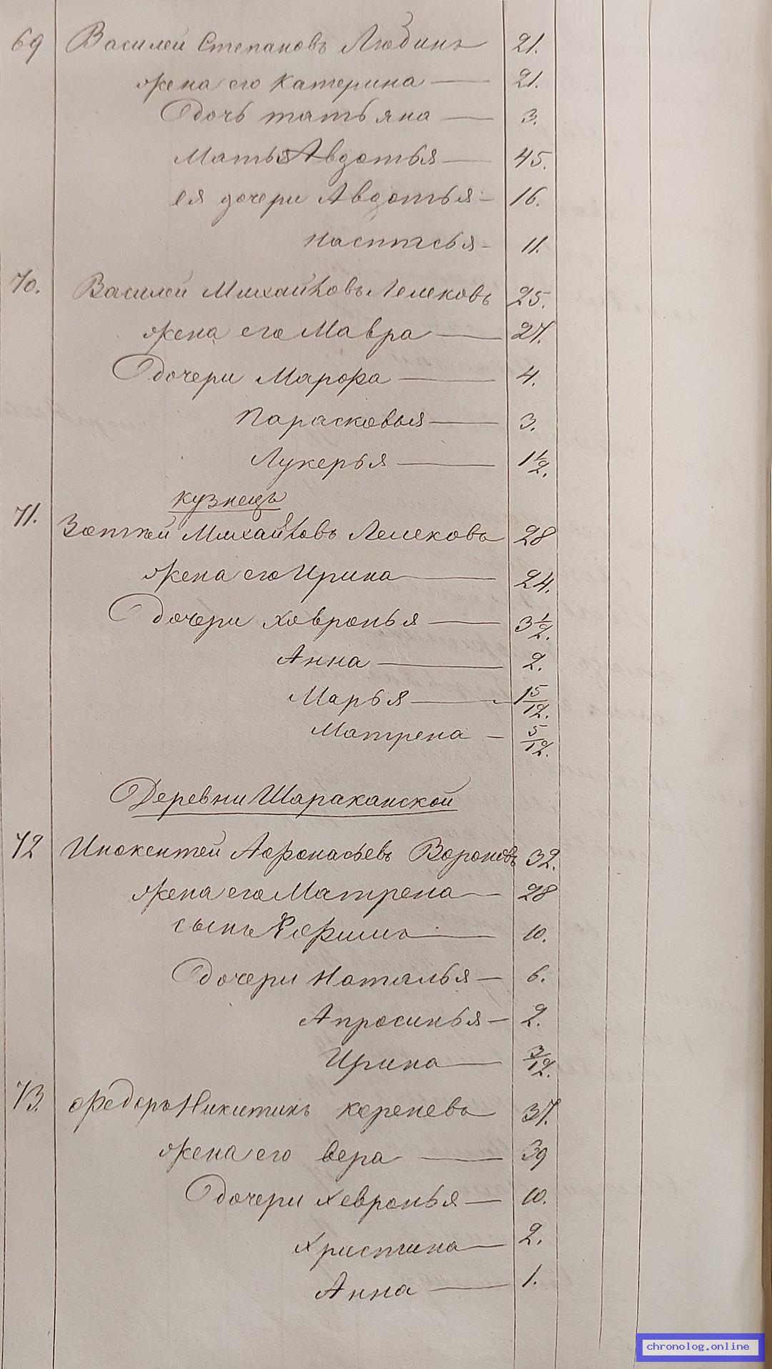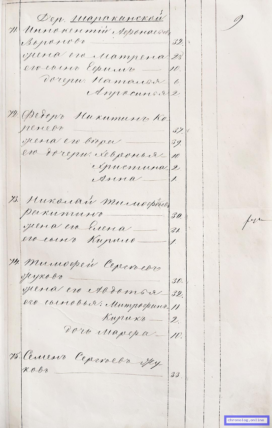 ГАЗК 30-2-270, Л.9, 152об (Посемейные списки переселенцев на р. Амур): Казак 1-го пешего батальона Иннокентий Афонасьевич Воронов 32 жена его Матрена 28 сын Ефим 10 дочери Наталья 6 Апросинья 2 Ирина 3 месяца. Исход: деревня Шараканская Нерчинского уезда. Снимки: 9, 152об. | |||