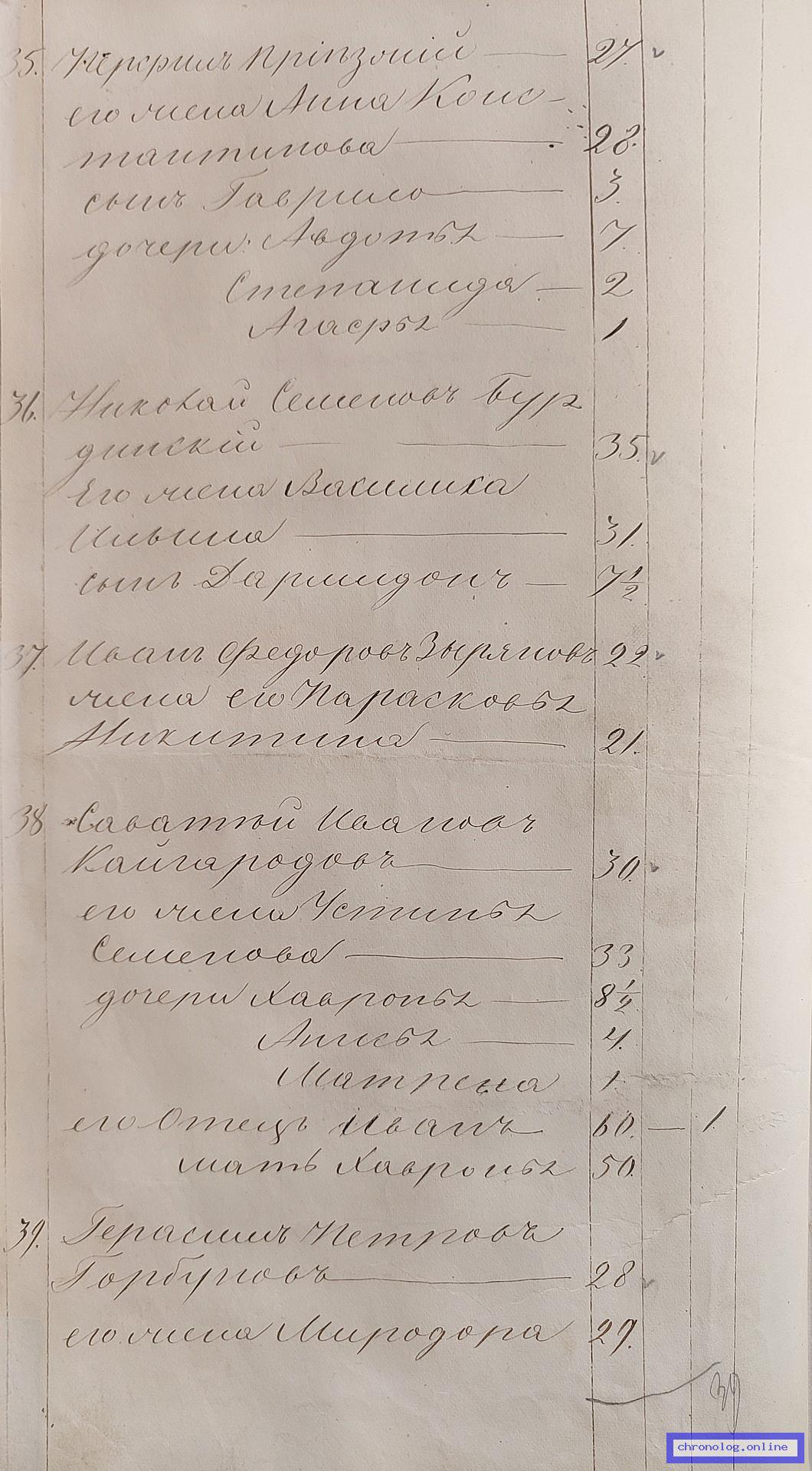 ГАЗК 30-2-270, Л.19об, 163 (Посемейные списки переселенцев на р. Амур): Казак 2-го пешего батальона Николай Семёнович Бурдинский 35 его жена Василиса Ильина 31 сын Дормидонт 7?. Исход: деревня Чупрова Нерчинского уезда. Снимки: 19об, 163. | |||