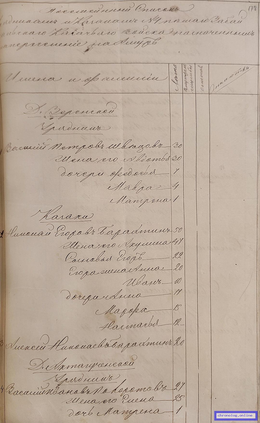 ГАЗК 30-2-270, Л.33, 178 (Посемейные списки переселенцев на р. Амур): Урядник 4-го пешего батальона Василий Иванович Полоротов 27 жена его Елена 25 дочь Матрена 1. Исход: деревня Актагучинская Нерчинского уезда. Снимки: 33, 178. | |||