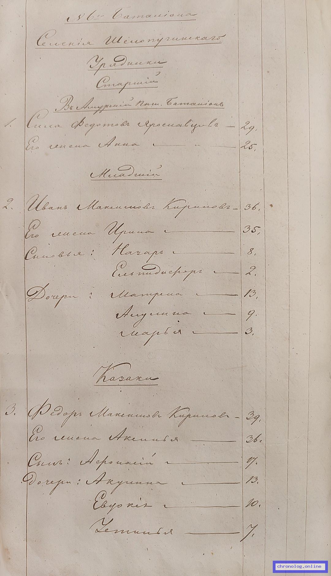 ГАЗК 30-2-270, Л.61, 199об (Посемейные списки переселенцев на р. Амур): Урядник 6-го пешего батальона Сила Федотович Ярославцев 28 его жена Анна 24 дочь Ирина 1. Исход: село Шелопугинское Нерчинского уезда. Снимки: 61, 199об. | |||