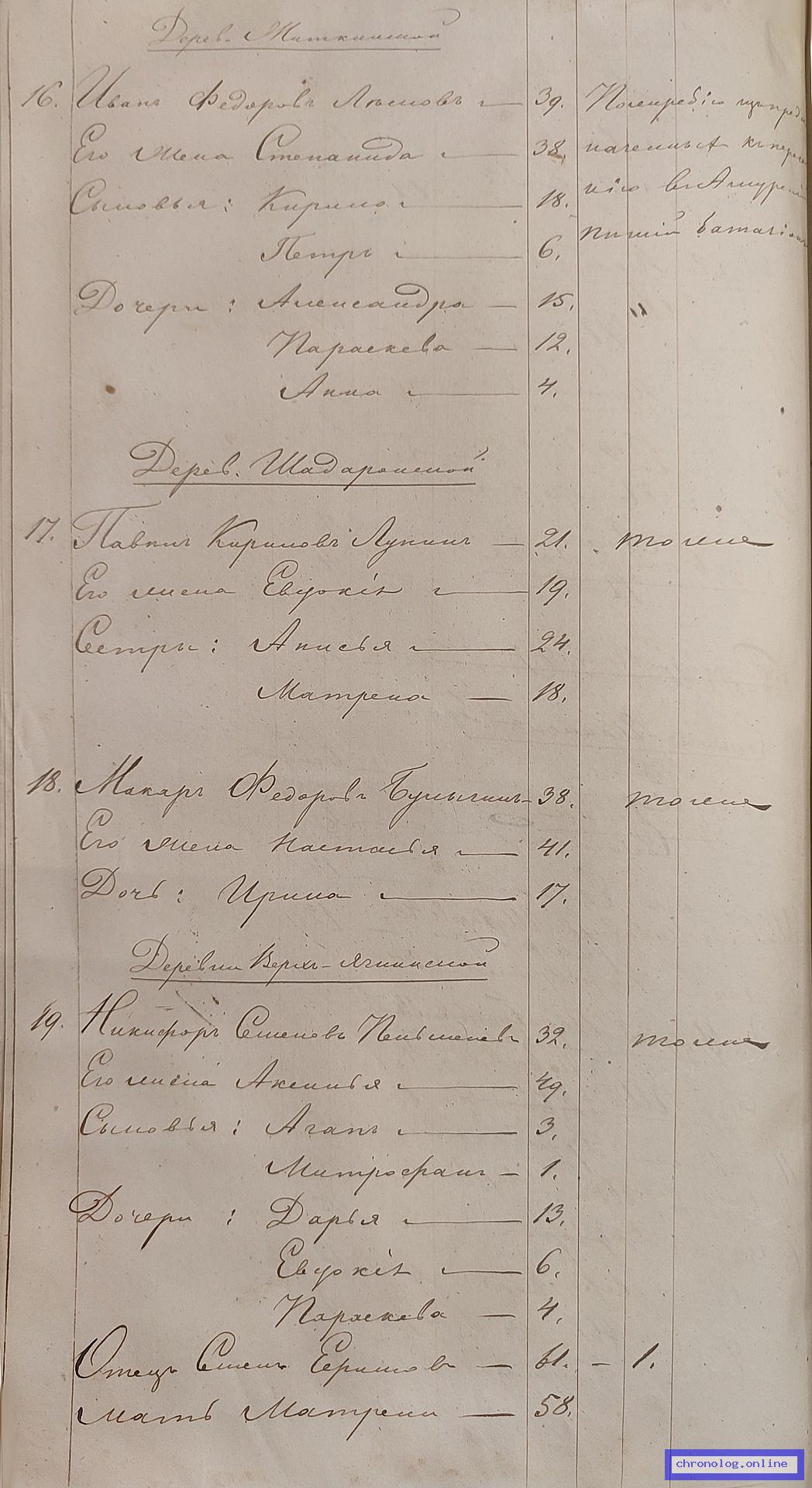 ГАЗК 30-2-270, Л.62об, 201об (Посемейные списки переселенцев на р. Амур): Казак 6-го пешего батальона Макар Фёдорович Булыгин 38 его жена Настасья 41 дочь Ирина 17. Исход: деревня Шадаронская Нерчинского уезда. Снимки: 62об, 201об. | |||