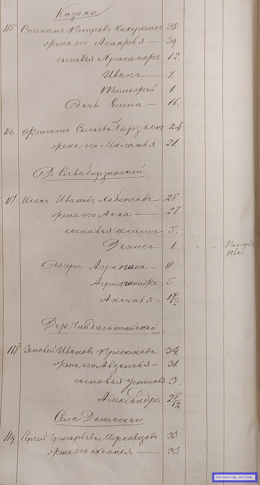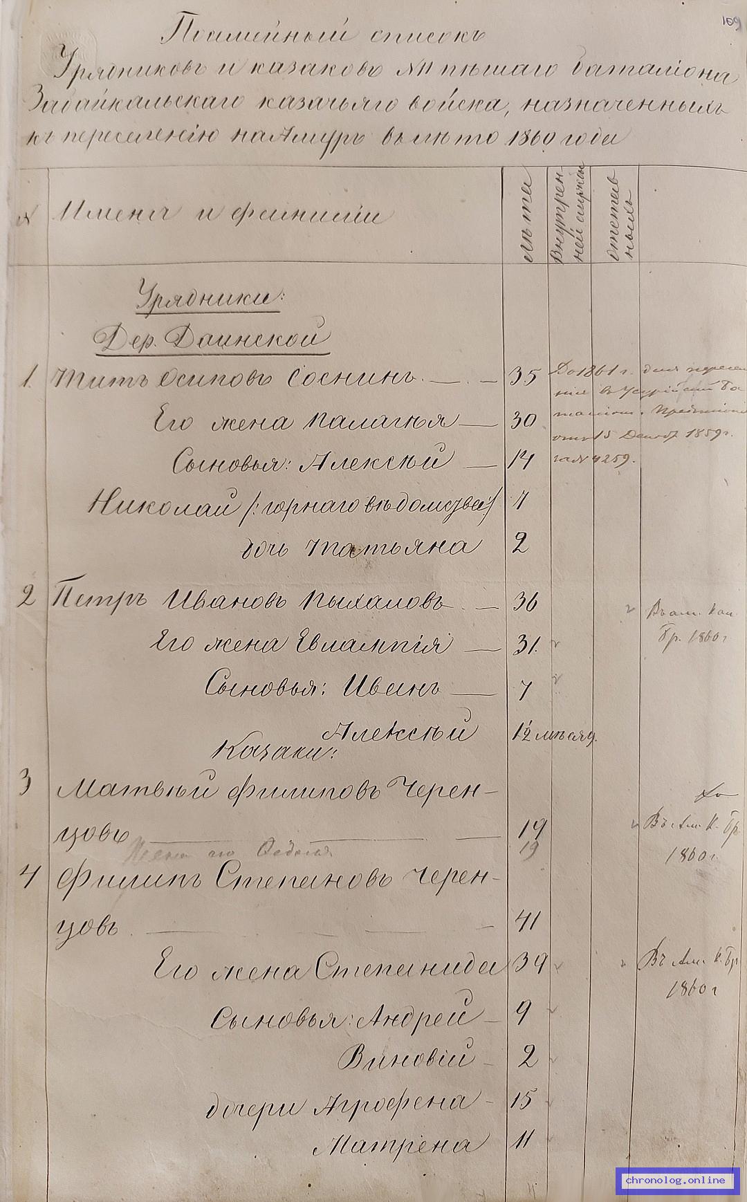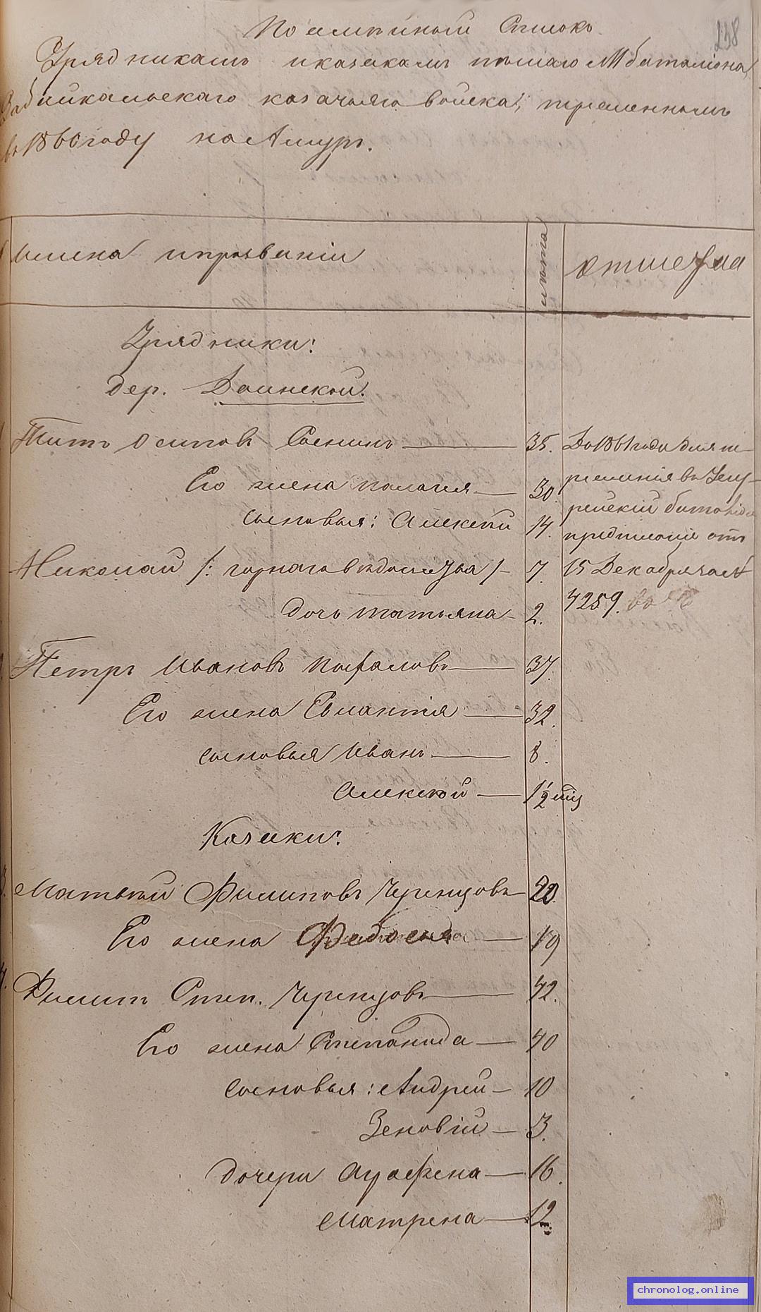 ГАЗК 30-2-270, Л.5, 149 (Посемейные списки переселенцев на р. Амур): Казак 1-го пешего батальона Степан Михайлович Чипизубов 36 жена его Авдотья 36 сын Капитон 4 дочери Татьяна 15 Елена 3 месяца. Исход: деревня Мулинская Нерчинского уезда. Снимки: 5, 149. | |||