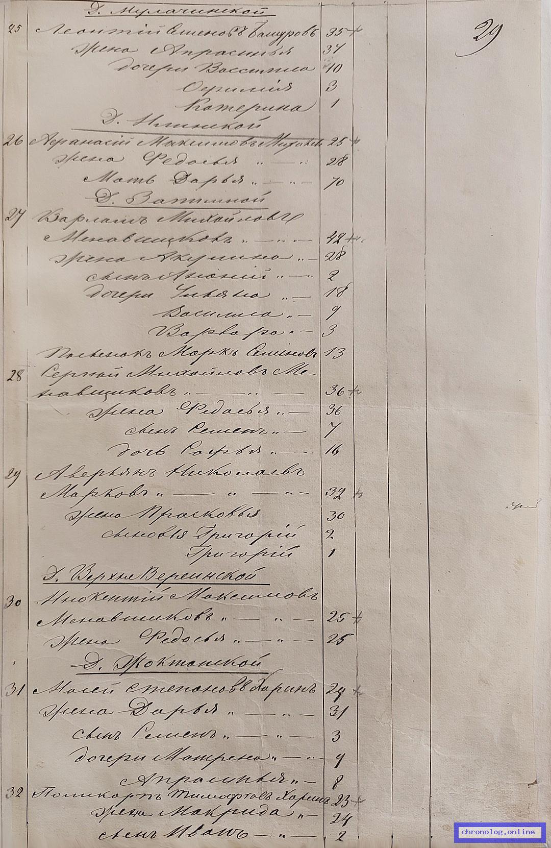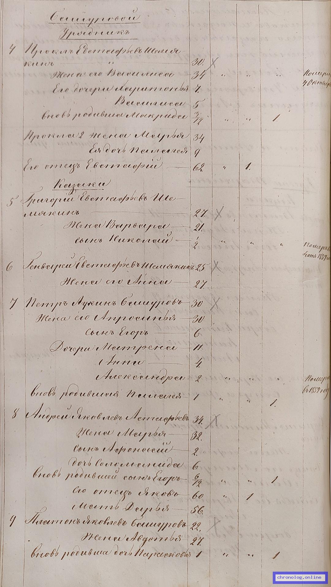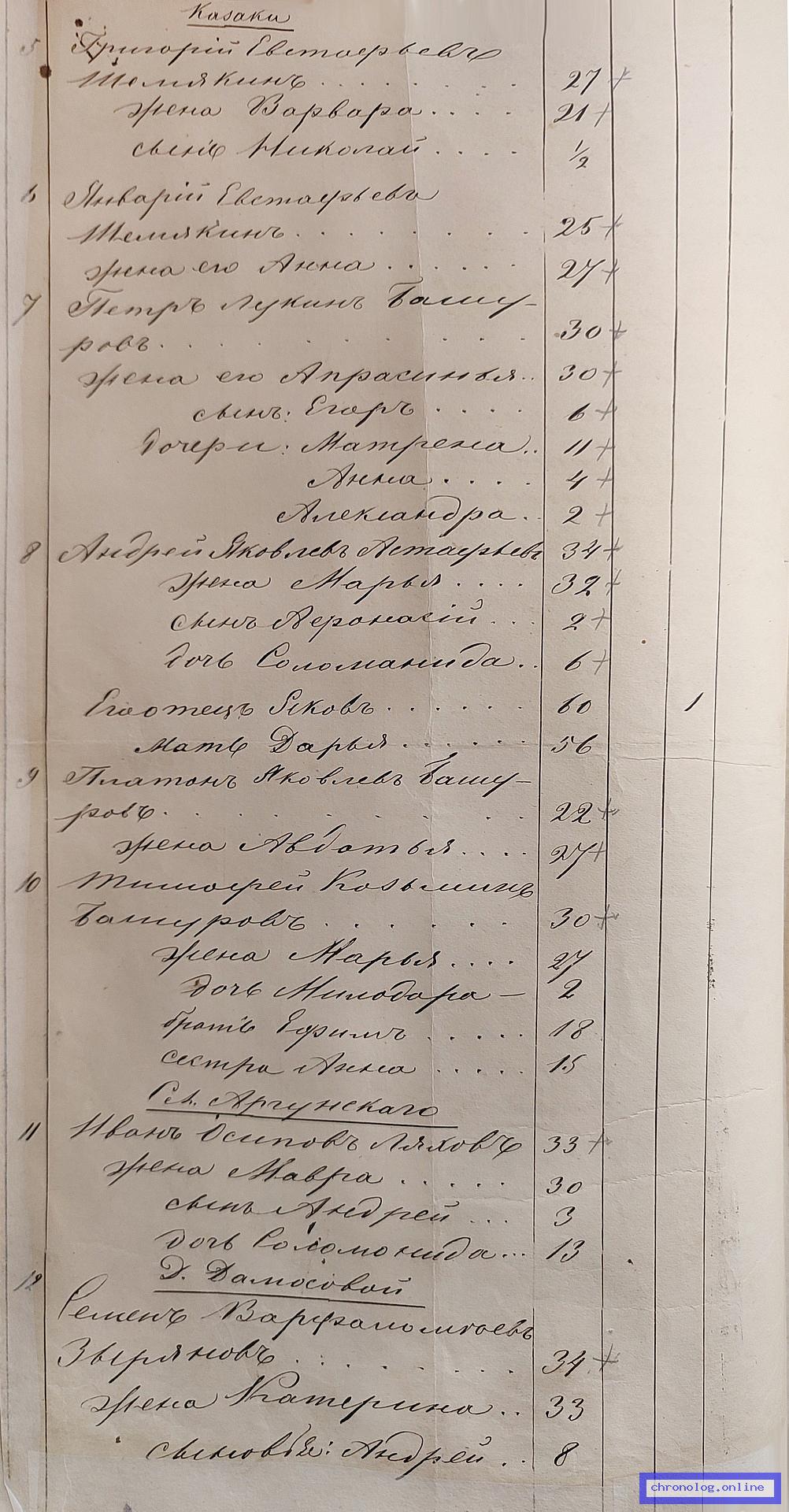ГАЗК 30-2-270, Л.27об, 171 (Посемейные списки переселенцев на р. Амур): Казак 3-го пешего батальона Семён Варфоломеевич Зырянов 34 жена его Катрина 33 сыновья Андрей 8 Егор 5 Федот 2 Семен 1 дочь Катерина 13. Исход: деревня Дамосова Нерчинского уезда. Снимки: 27об, 171. | |||