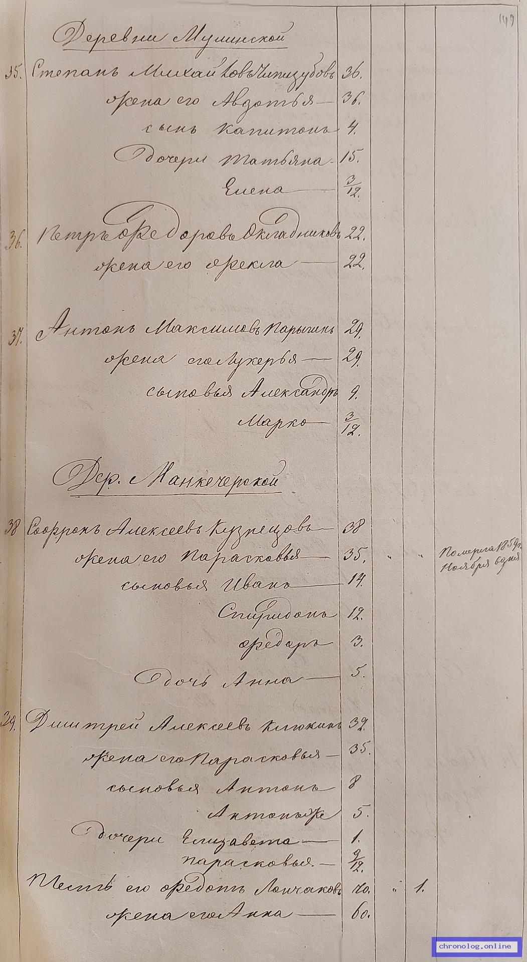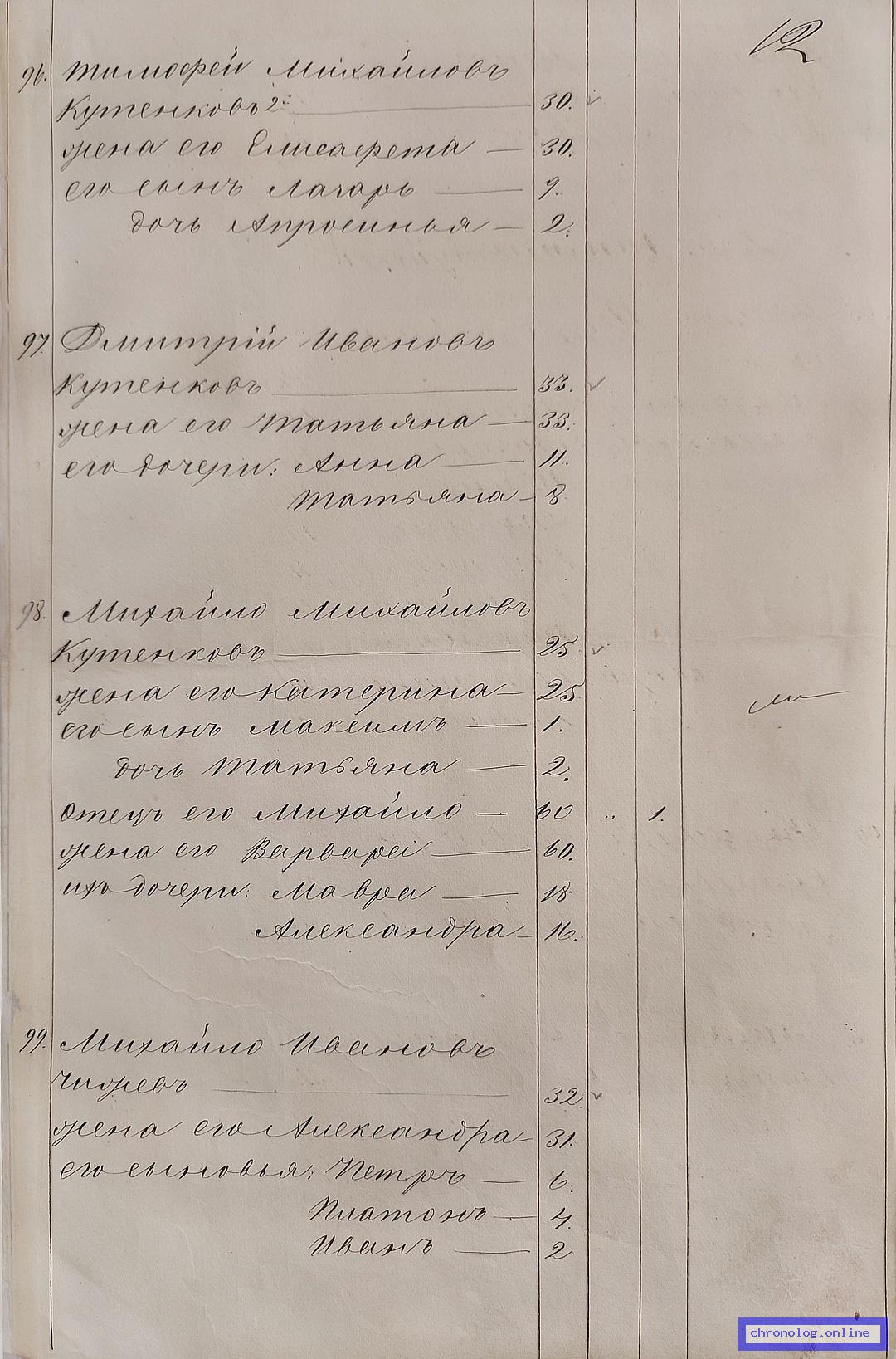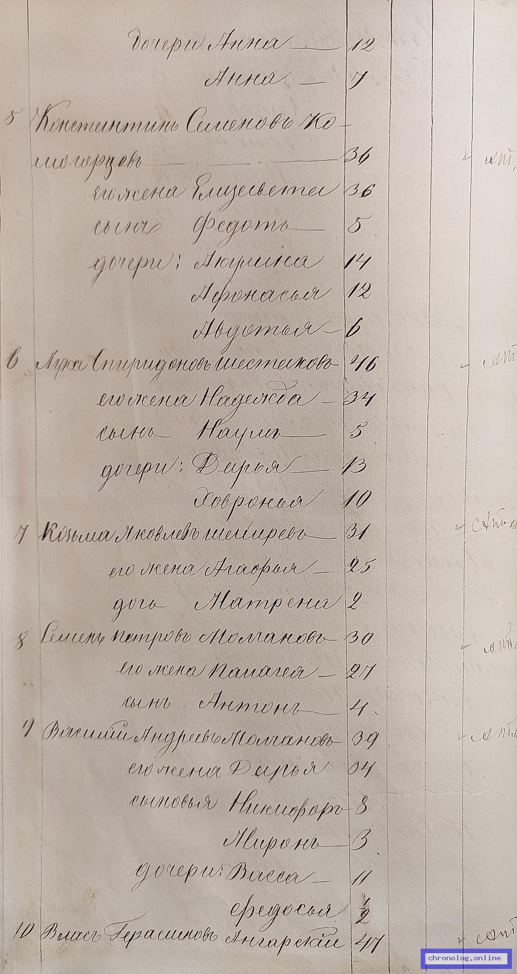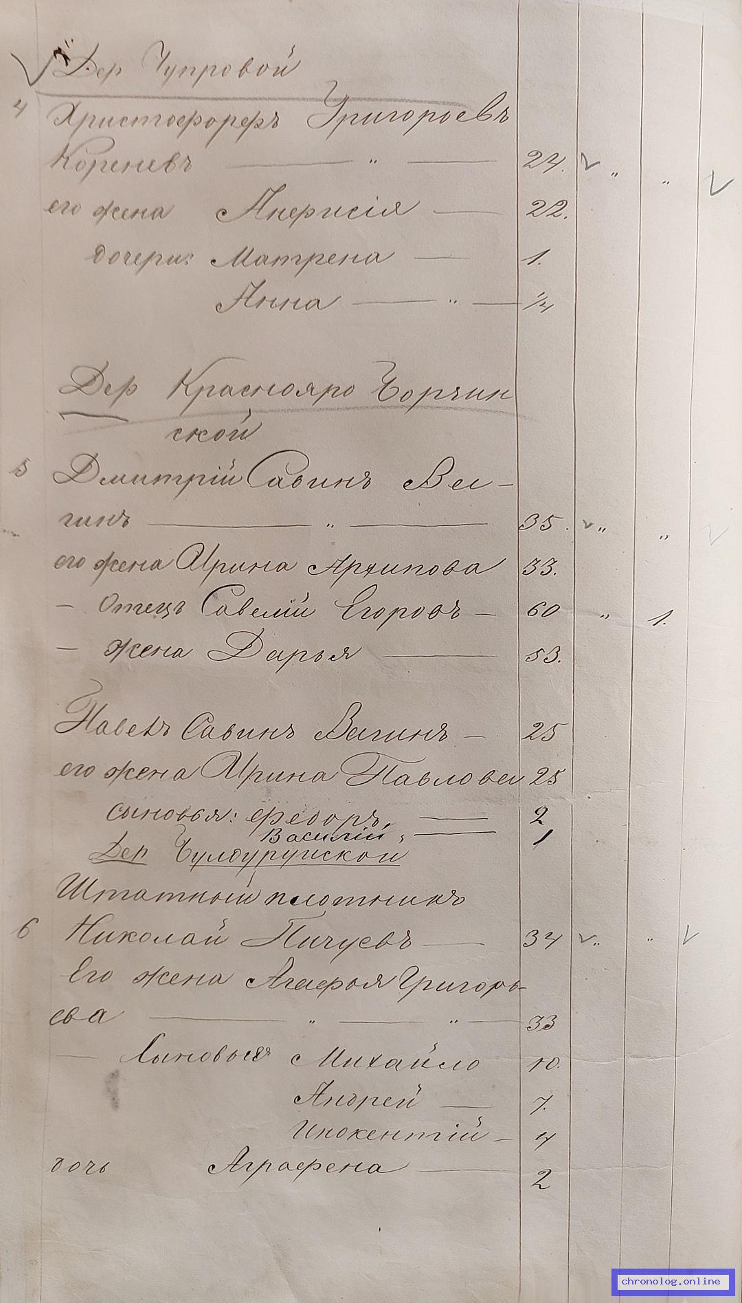 ГАЗК 30-2-270, Л.27об, 171 (Посемейные списки переселенцев на р. Амур): Казак 3-го пешего батальона Семён Варфоломеевич Зырянов 34 жена его Катрина 33 сыновья Андрей 8 Егор 5 Федот 2 Семен 1 дочь Катерина 13. Исход: деревня Дамосова Нерчинского уезда. Снимки: 27об, 171. | |||