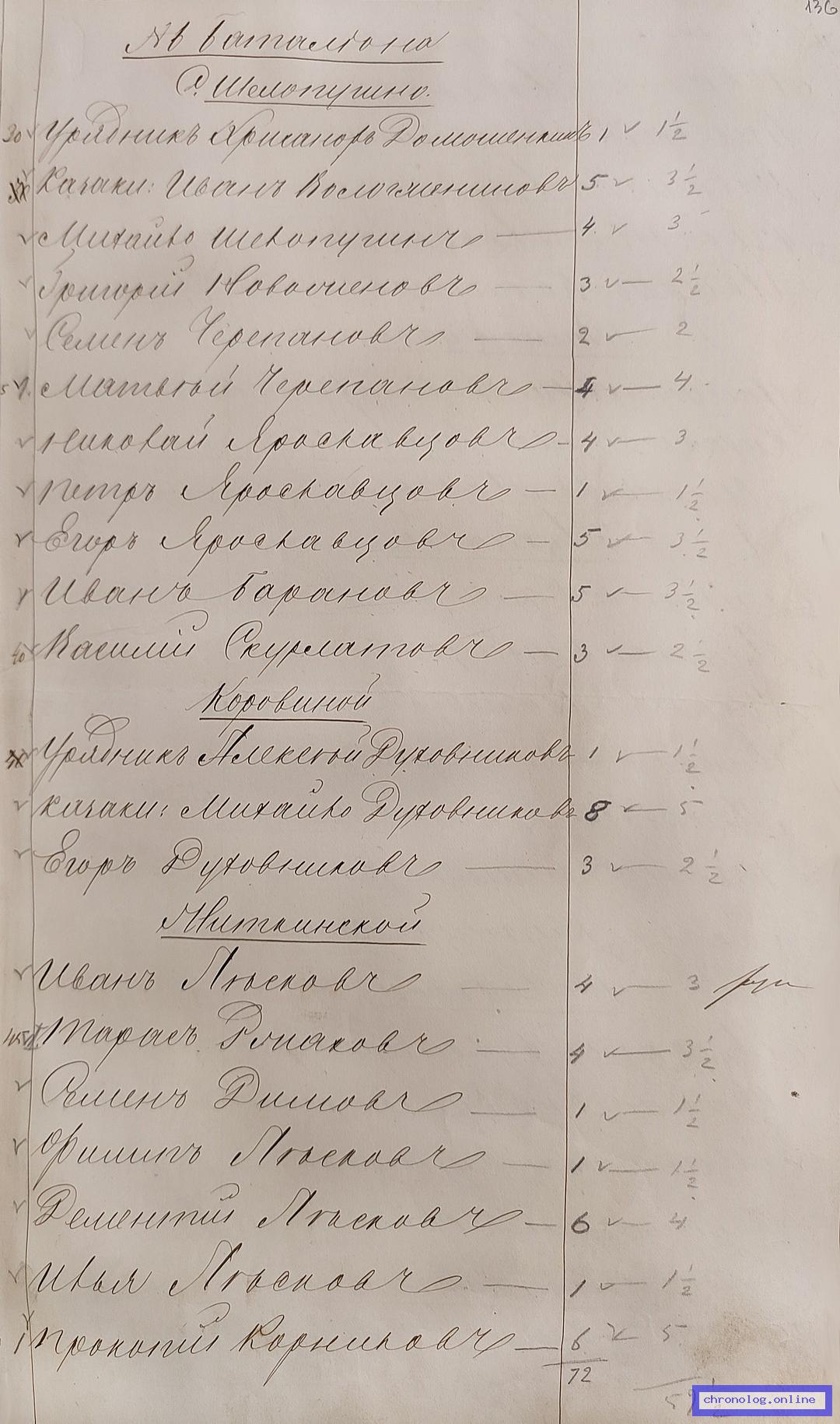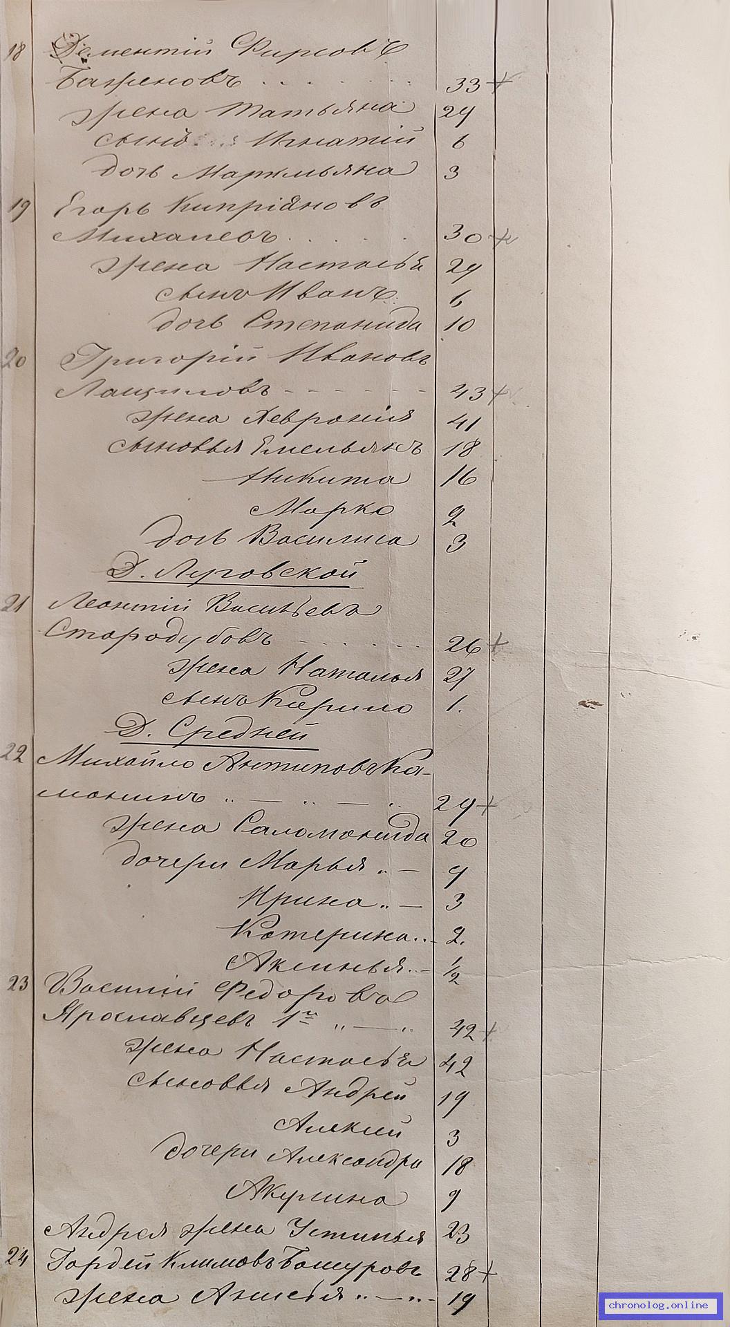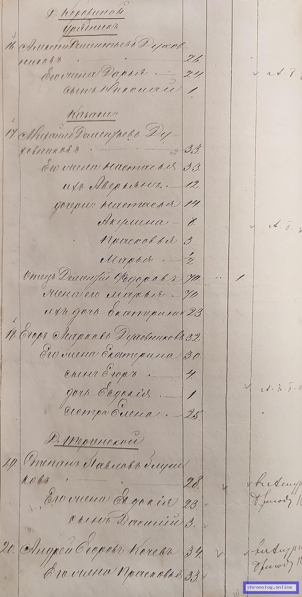 ГАЗК 30-2-270, Л.52об, 136 (Посемейные списки переселенцев на р. Амур): Урядник 6-го пешего батальона Алексей Дементьевич Духовников 26 его жена Дарья 24 сын Николай 1. Исход: деревня Коровина Нерчинского уезда. Снимки: 52об, 136. | |||