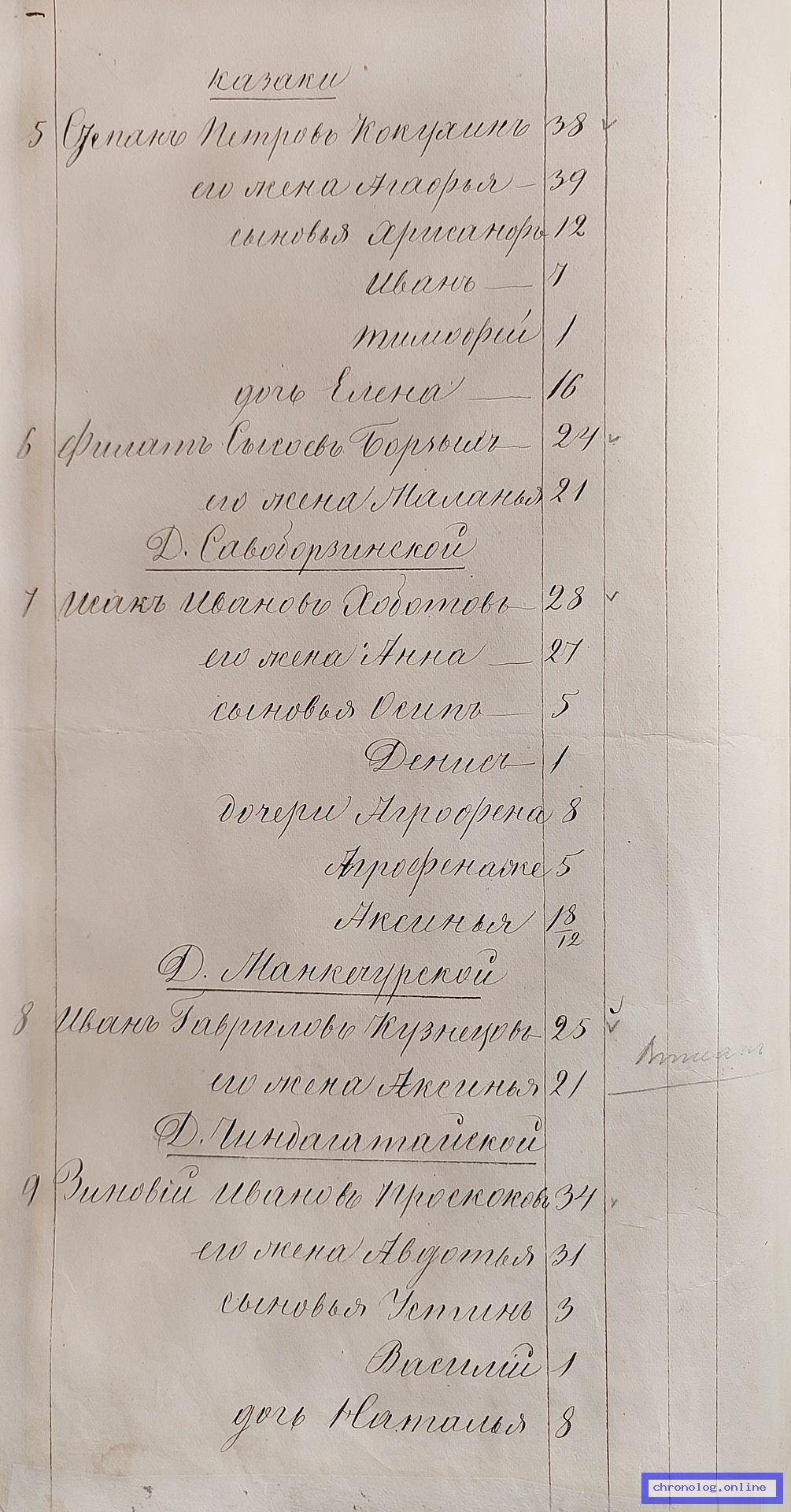 ГАЗК 30-2-270, Л.58, 137 (Посемейные списки переселенцев на р. Амур): Казак 6-го пешего батальона Иван Васильевич Мальцов 25 его жена Степанида 25 сын Сидор полгода. Исход: деревня Туровская Нерчинского уезда. Снимки: 58, 137. | |||